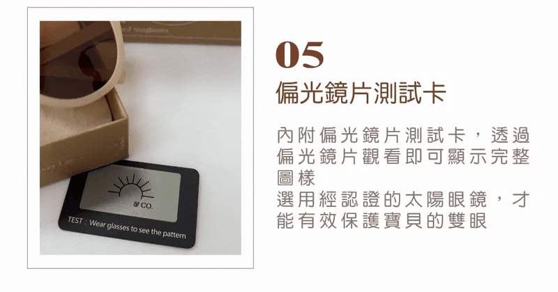 全配款/ 太陽眼鏡 x1、皮扣眼鏡袋 x1、眼鏡布 x1、偏光測試片