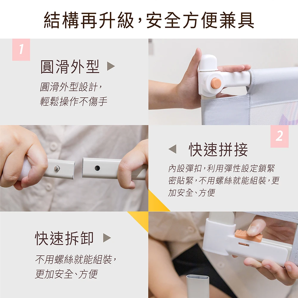 全面防護:特別設計的上橫桿防撞墊,無論是睡夢滾動、或是不小心跌倒都不怕傷到寶寶。