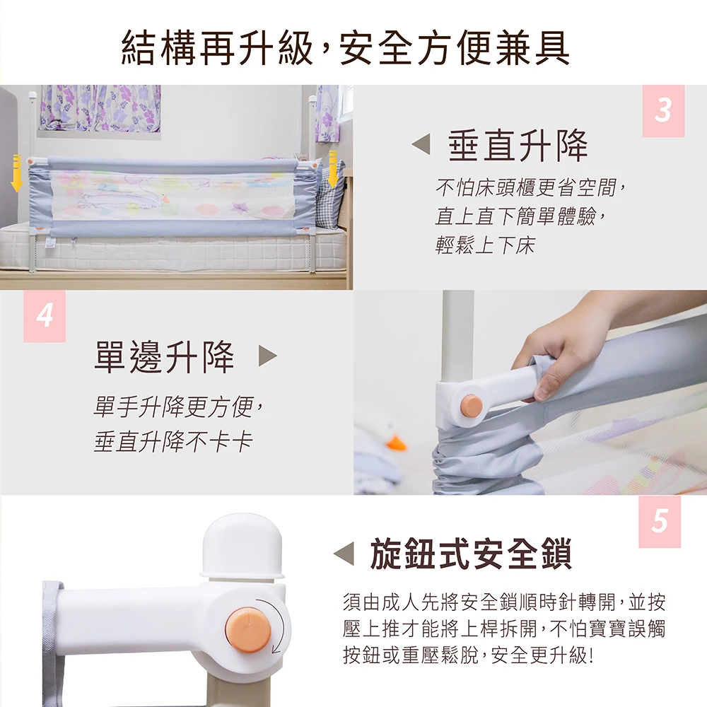 靈活升降設計:無論房間有多窄,貝貝佳升降床邊護欄都能輕鬆垂直或單邊升降,告別空間困擾!