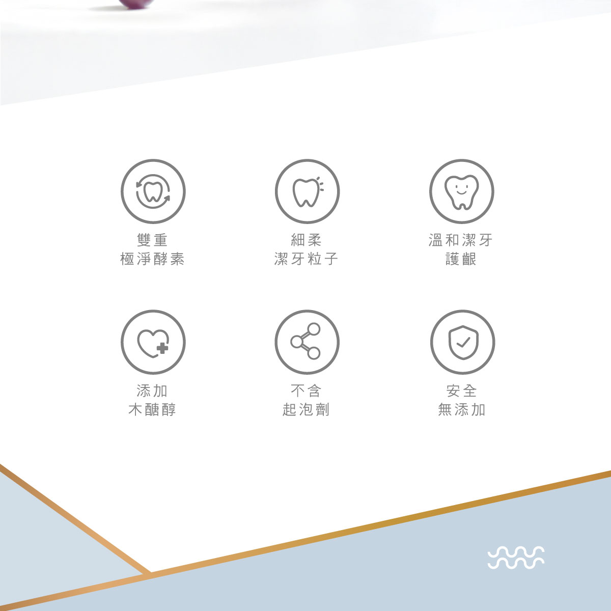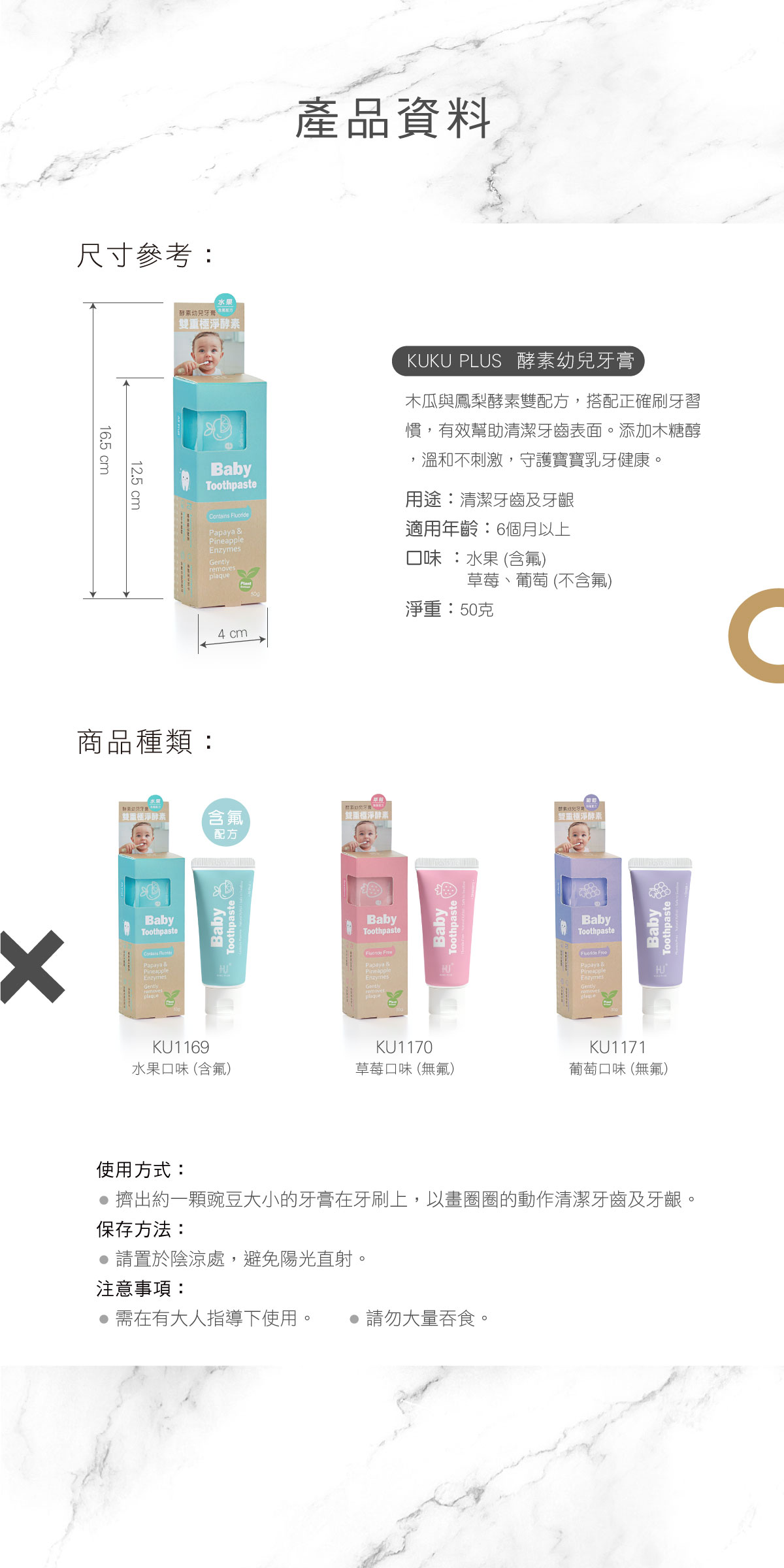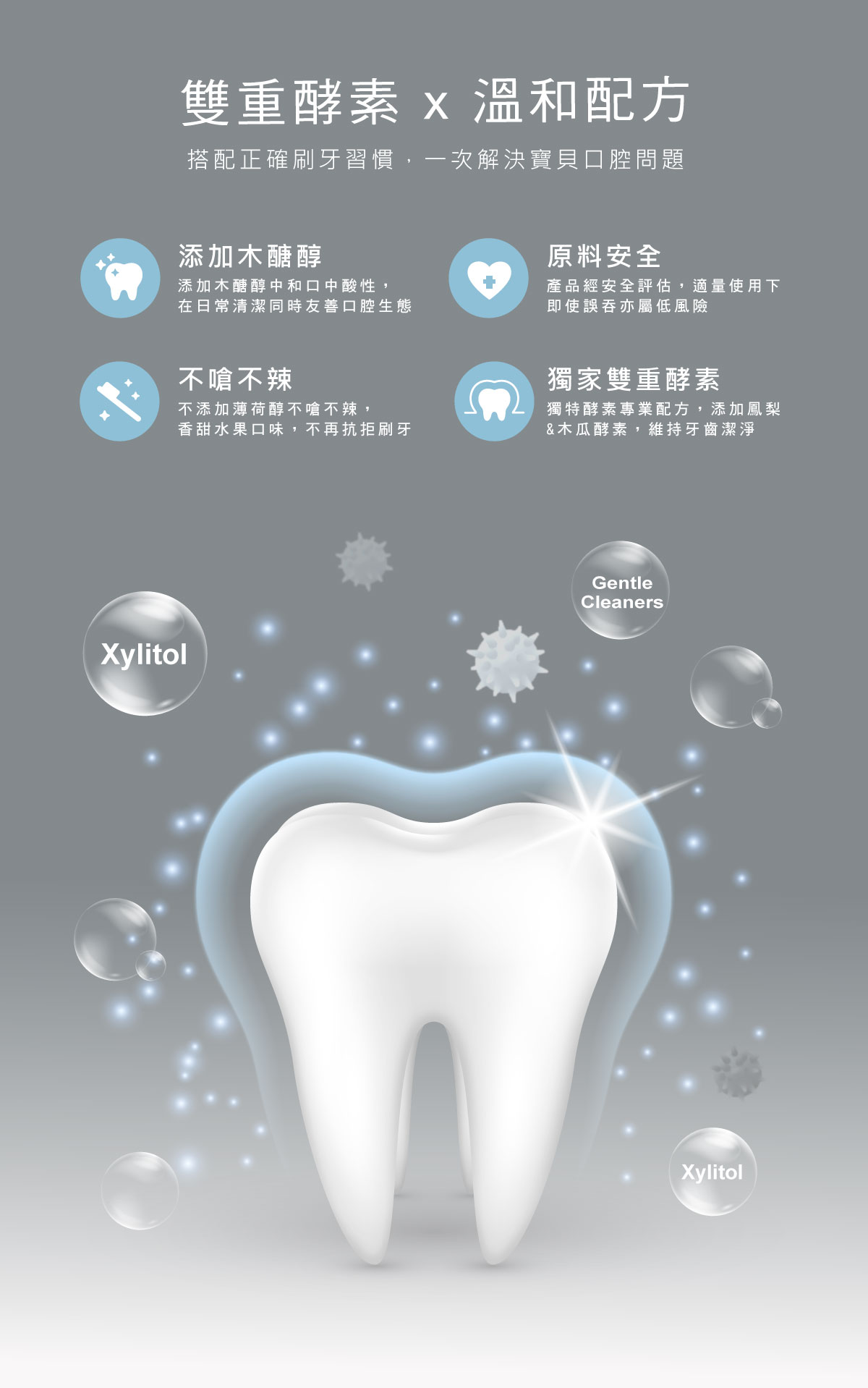 1.溫和柔性的香甜口味,小朋友天天愛用。 2.溫和潔牙粒子,不傷琺瑯質。 3.添加木糖醇,中和口中酸性。 4.不小心吞下去也很安全。