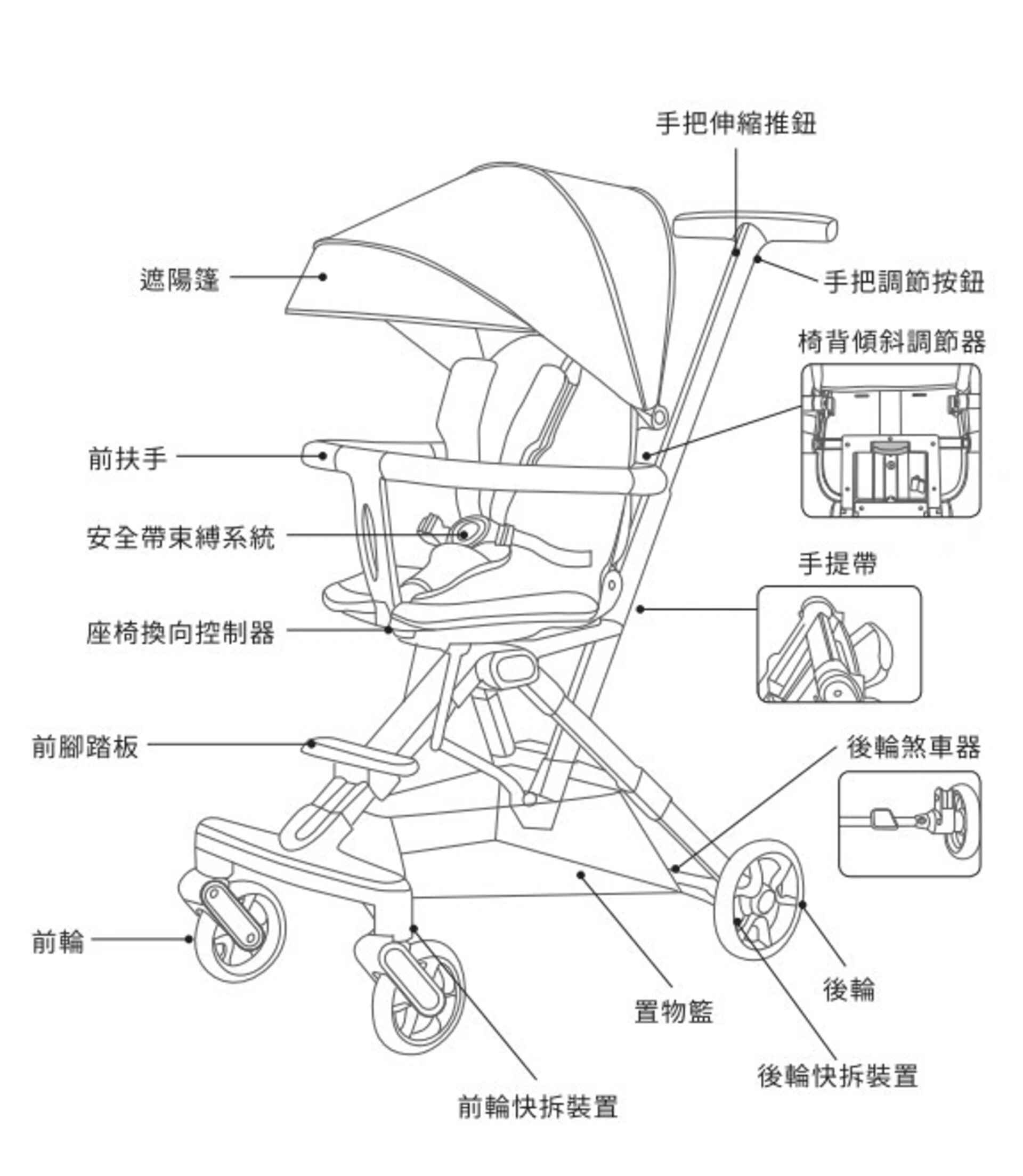 • 不要讓手推車長時間暴曬,即使正常的日光照射也可能會造成面料顏色發生變化。