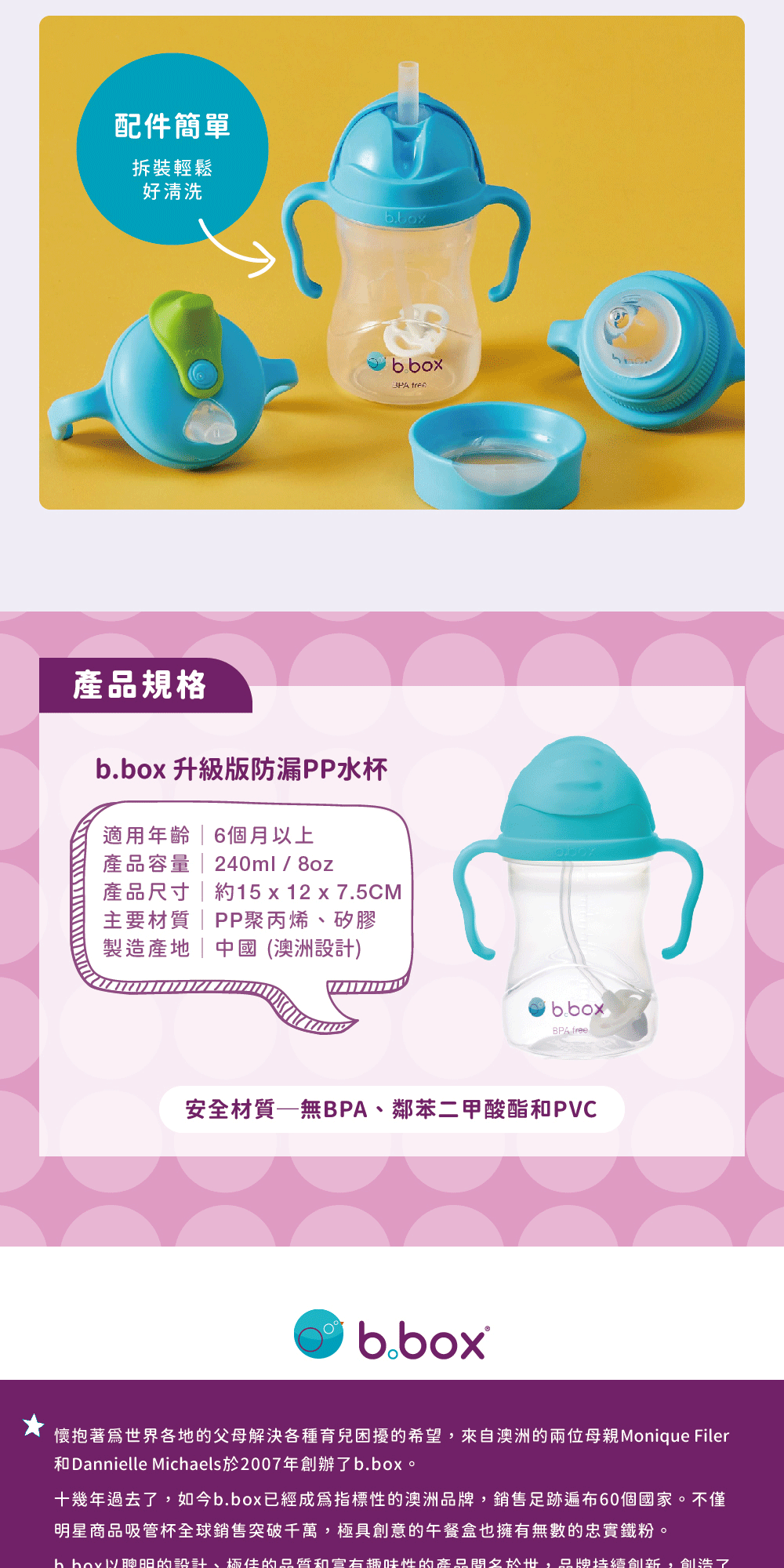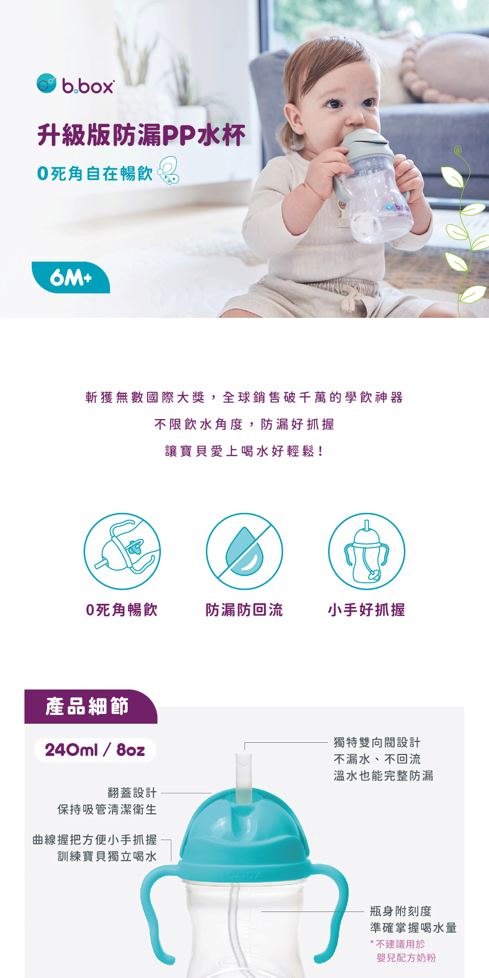• 易握把手,訓練寶寶自主喝水