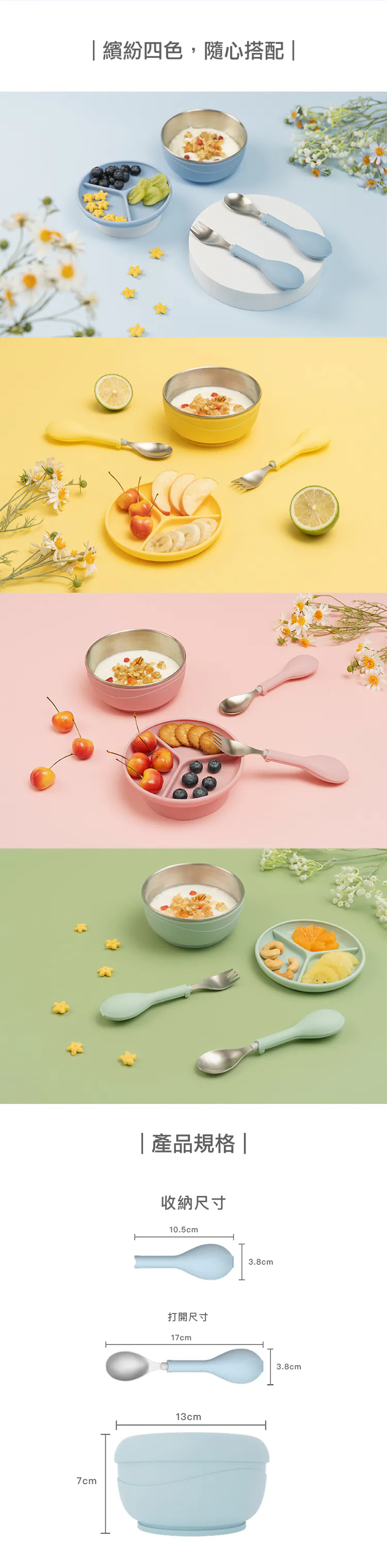 規格/內容物:學習碗x1 (不鏽鋼內碗+矽膠防燙外碗)、矽膠分隔上蓋x1、矽膠吸盤x1、翻滾環保湯匙x1、翻滾環保叉子x1