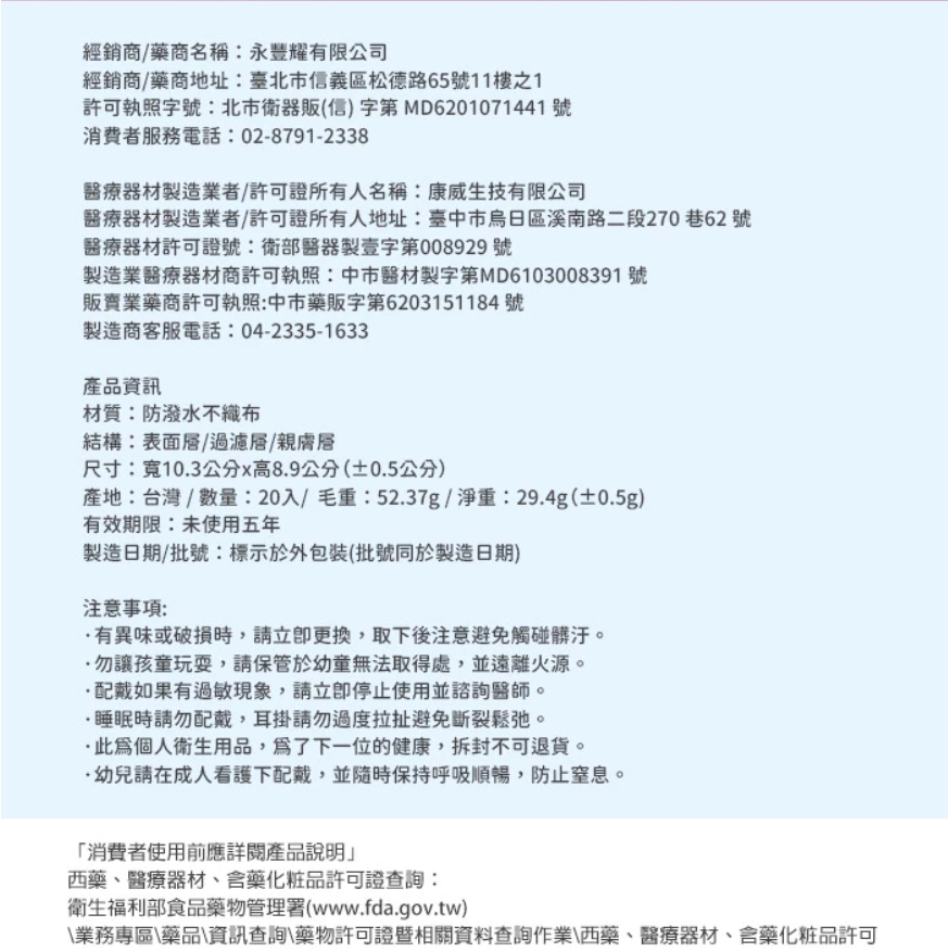 -販售業者 醫療器材商名稱:棉芽寶貝坊 醫療器材商諮詢專線:0925-252-371 販賣業醫療器材商許可執照:雲線藥販字第MD6239012592號 ■醫療器材商地址:雲林縣北港鎮好收里好收路111之1號 -注意事項 1.有異味或破損時,請立即更換,取下後注意避免碰觸髒污。 2.勿讓孩童玩耍,保管於幼童無法取得處,並遠離火源。 3.配戴如果有過敏現象,請立即停止使用並諮詢醫師。 4.睡眠時請勿配戴,耳掛請勿過度拉扯避免斷裂鬆弛。 5.此為個人衛生用品,為了下一位的健康,拆封不可退貨。 6.幼兒請在成人看護下配戴,並隨時保持呼吸順暢,防止窒息。
