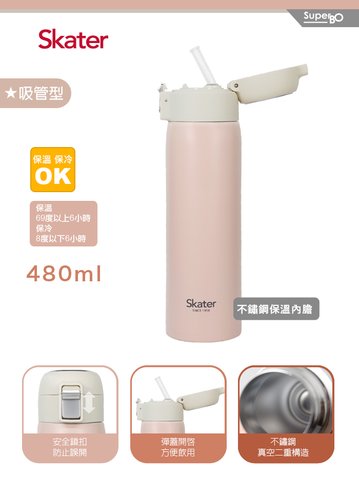 Skater 不鏽鋼吸管保溫瓶480ml (粉/綠)