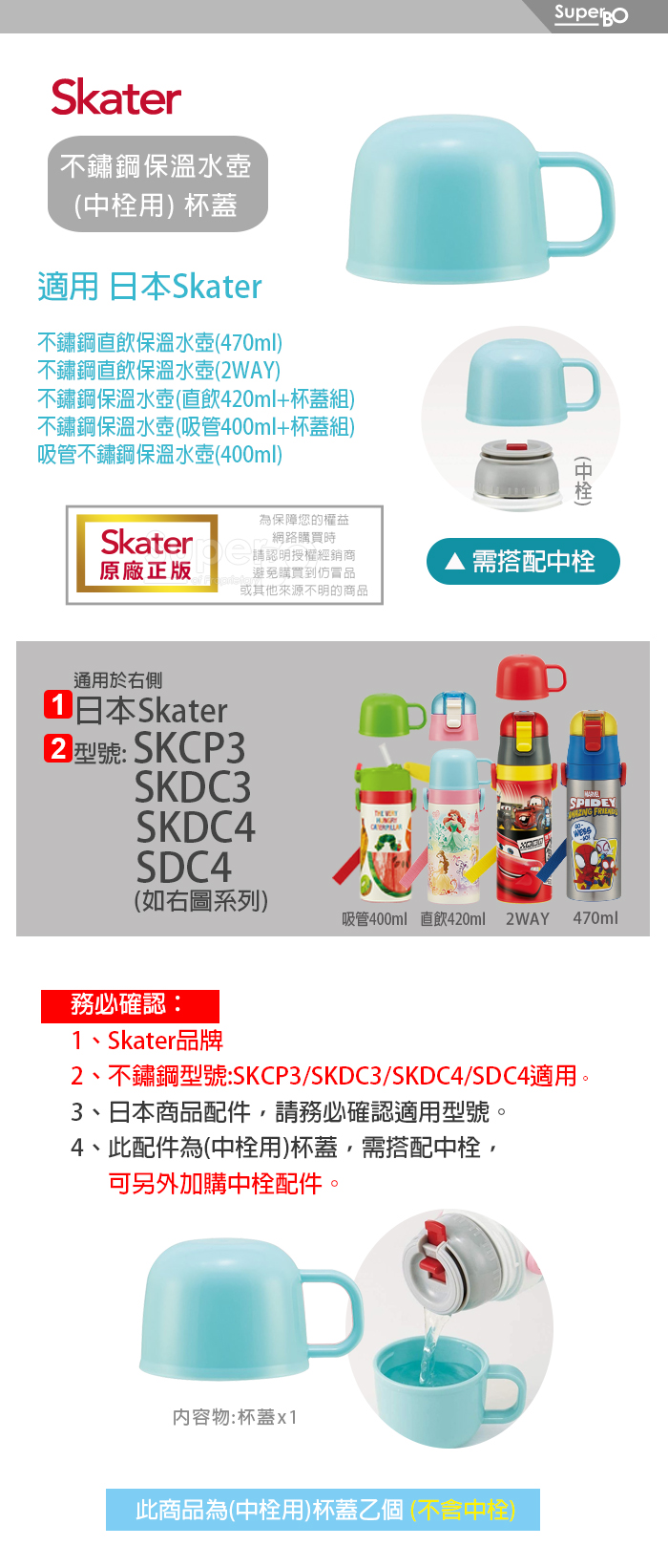 ◆Skater不鏽鋼保溫水壺(中栓)專用上蓋◆需搭配中栓,無法單獨於水壺上使用。◆只適用於型號SDC4、SKDC3,此品不適用於其他水壺,請確認所需。材質:PP 耐溫:120度注意事項:● 請以海綿清洗.勿用鋼刷或硬質物洗滌.以免刮傷。● 此品為原裝進口,若拆封後無法復原,請確認所需後再請購買