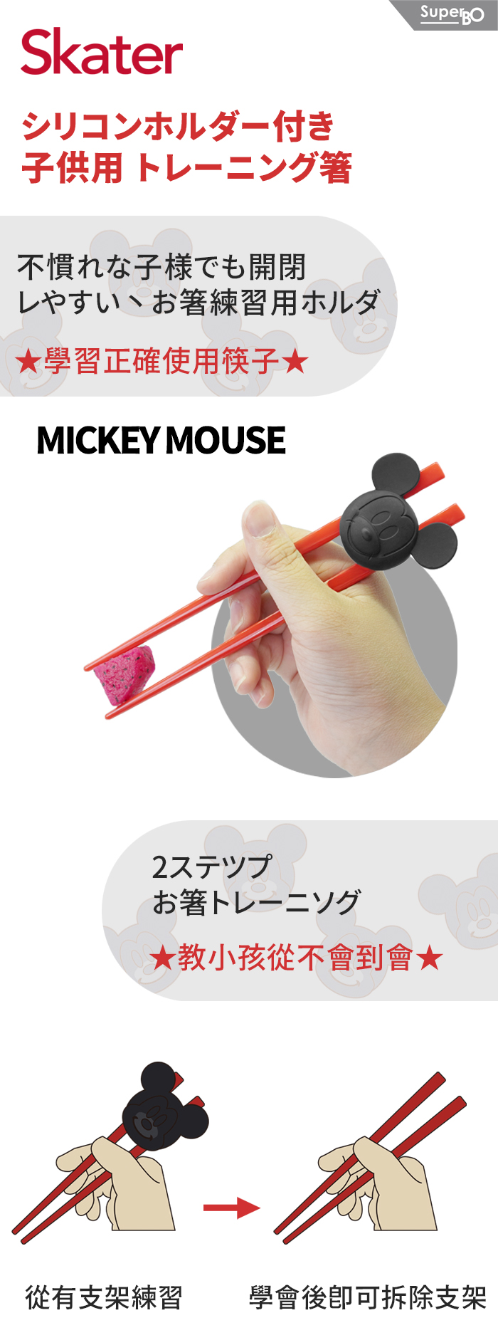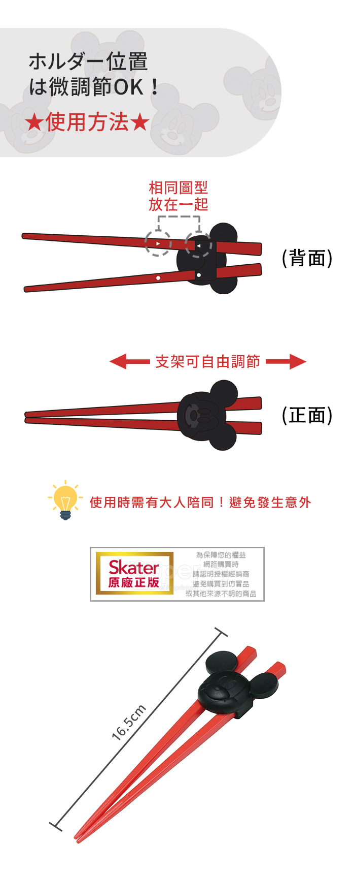 ◆幼兒用學習筷。◆上方支架可隨手的大小調整位置。◆支架拆下後,可當一般筷子使用。材質:筷子 壓克力/80度支架 矽膠/140度尺 寸:約16.5 cm產地:日本1、請在成人看護下使用。2、請以海綿清洗,勿用鋼刷或硬質物洗滌,以免刮傷。3、請勿置入於微波爐,洗碗機,烘碗機及蒸汽消毒鍋使用,可能會導致產品變形或圖案剝落。