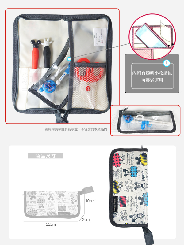 ◆外出收納餐具,內有多種隔層,可放置不同餐具。 ◆內附有透明小收納包,可靈活運用。 材質:外層 聚酯纖維尺寸:約22×10×高2 (cm) 1.請遠離火源,並以清水清洗既可。2.此品為原裝進口,若拆封後無法復原,請確認所需後再請購買3.圖片內展示餐具為示意,不包含於本產品內
