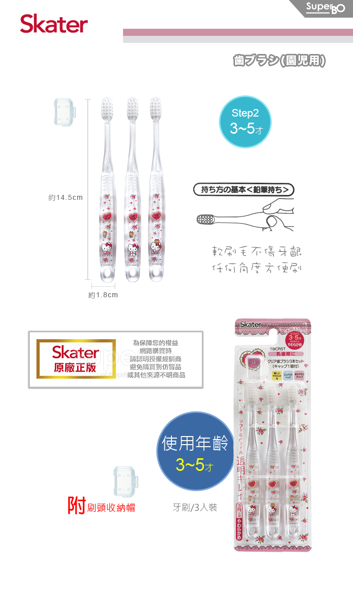 Skater 兒童牙刷(3-5歲)3入組 Kitty愛心