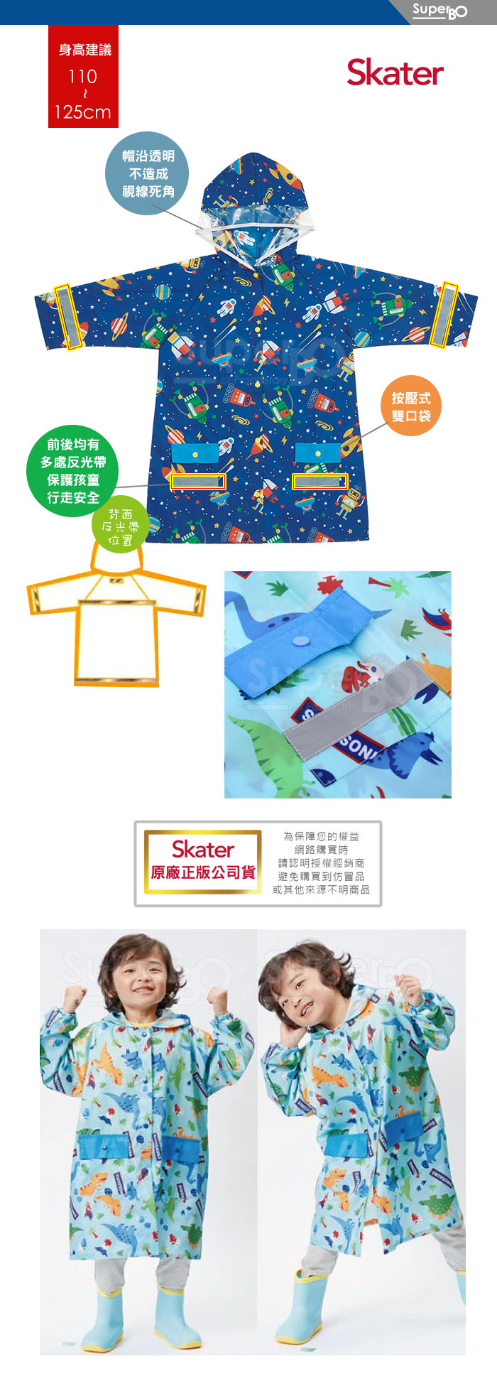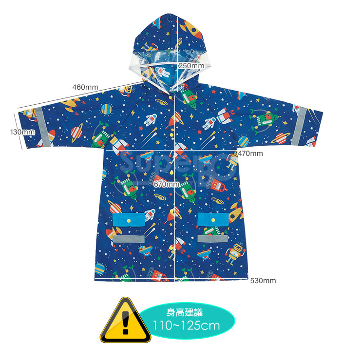 ◆前扣設計,穿脫方便。◆前後均有多處反光帶,保護孩童行走安全。◆帽沿透明設計,不造成視線死角。材質:聚酯纖維尺寸:約71 cm 產地:中國建議身高:110~125cm商檢字號 M3D717注意事項1、使用後請於通風處晾乾。2、汗水及摩擦皆有可能造成顏色脫落,此為正常現象。3、洗淨後請置於陰涼處晾乾,避免長時間陽光曝曬。4、不可漂白,不可熨燙。5、請遠離高溫及火源。