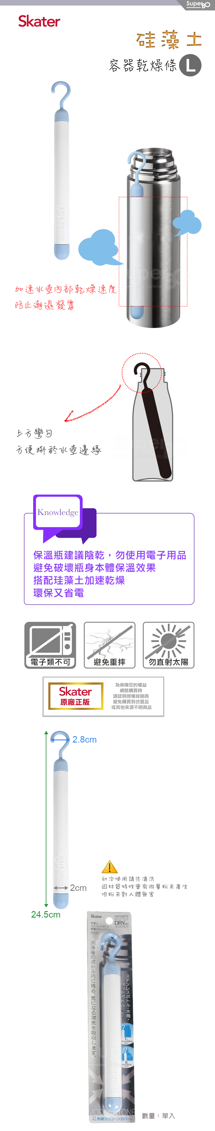 ◆加速水壺內部乾燥速度,防止潮濕發霉。 ◆上方彎勾,方便掛於水壺邊緣。◆適用於約1公升水壺。材質:珪藻土尺寸:約2x24.5 cm 保存方式:置於乾燥處 產地:中國 初次使用請先清洗,因材質特性會有微量粉末產生,但此粉末對人體無害1、清洗後請自然陰乾,勿直射太陽。2、請在成人陪同下使用。3、請勿重摔重擊,以免碎裂。2、此品為原裝進口,若拆封後無法復原,請確認所需後再請購買。