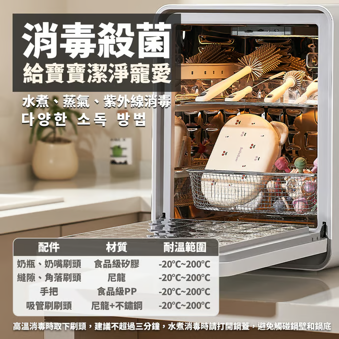 · 僅奶瓶刷奶嘴刷的矽膠刷頭可進行蒸氣高溫消毒(可紫外線消毒皆)。