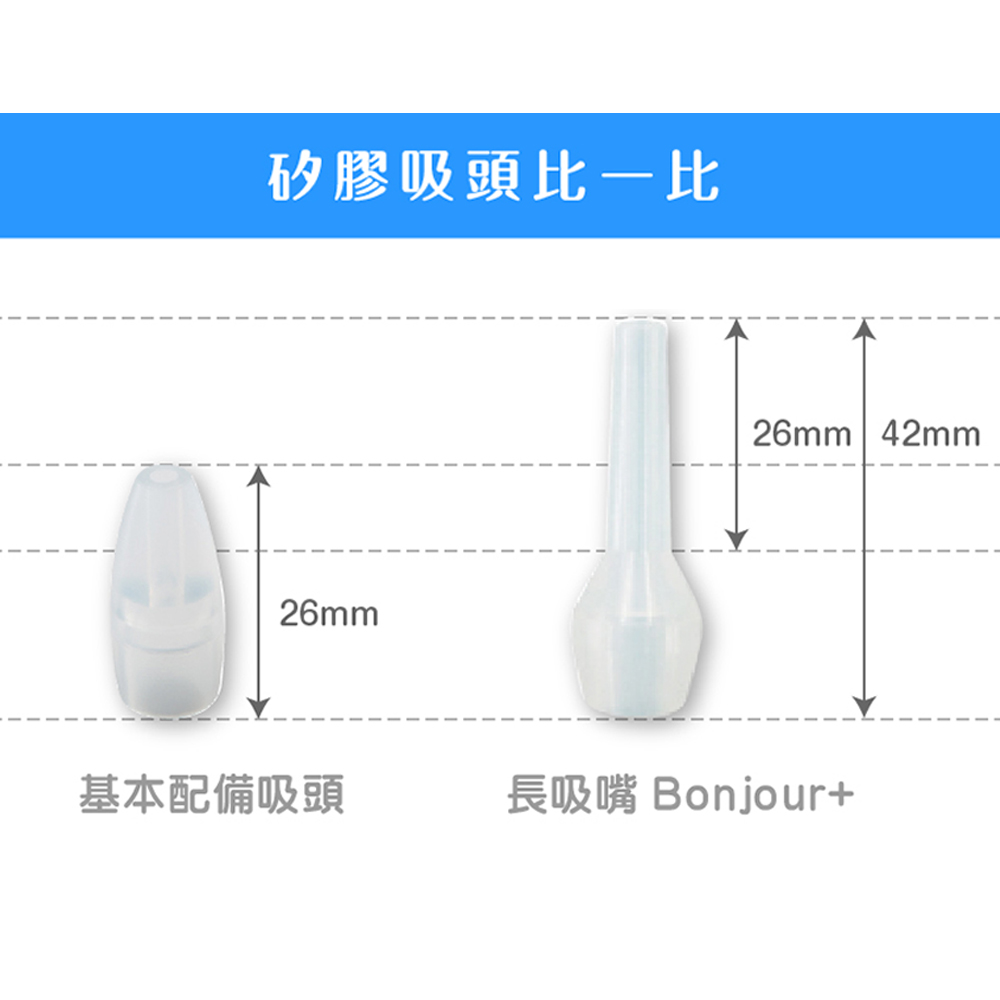 用途:加長吸嘴伸入鼻腔深處,針對頑強鼻涕單點強力吸取