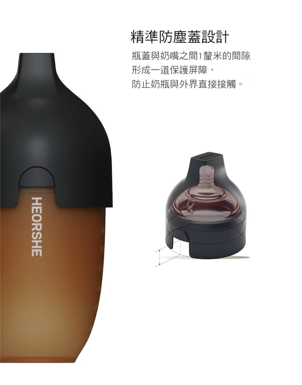 耐熱溫度: 瓶身、奶嘴、瓶頸(-20°C~180°C) / 瓶蓋(-20°C~100°C)