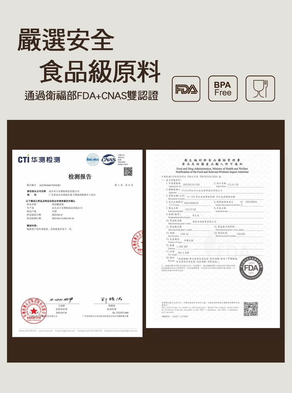耐熱溫度:盒體(20°C~80°C) / 盒蓋(20°C~70°C) / 勺子(<100°C) / 密封圈(<100°C)