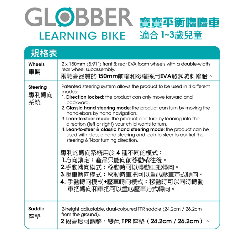 ※規格及重量以實車為準,GLOBBER原廠保留規格變動權利。