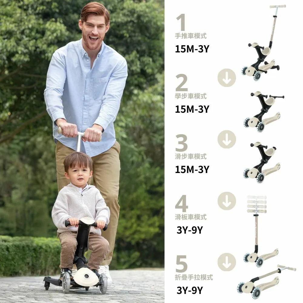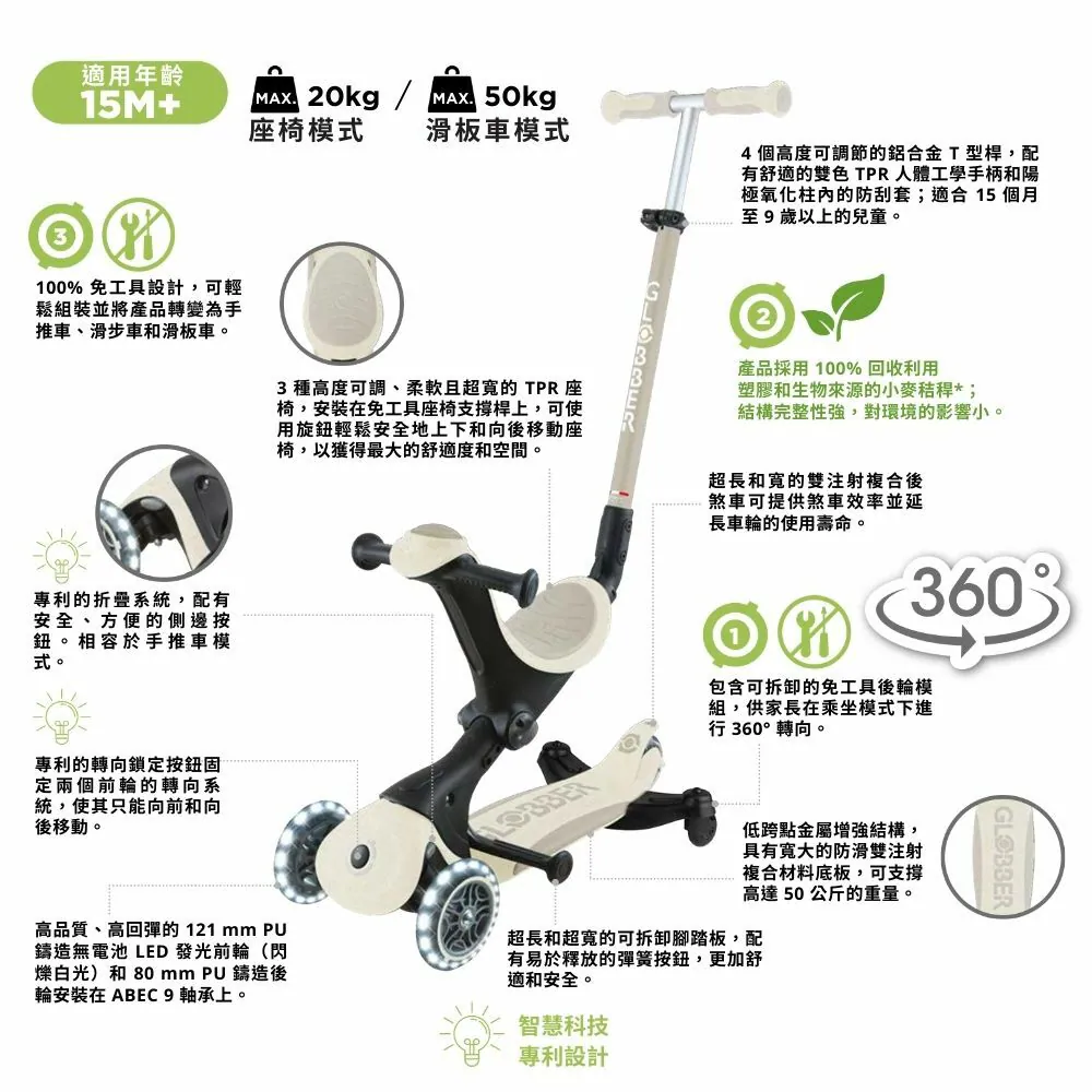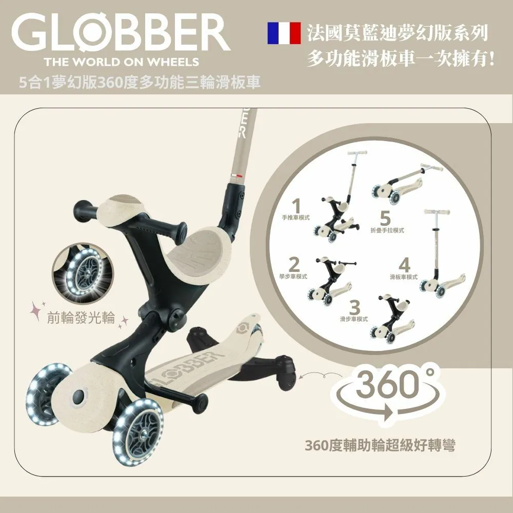 法國GLOBBER GO‧UP 5合1夢幻版360度多功能三輪滑板車 (白光發光前輪)