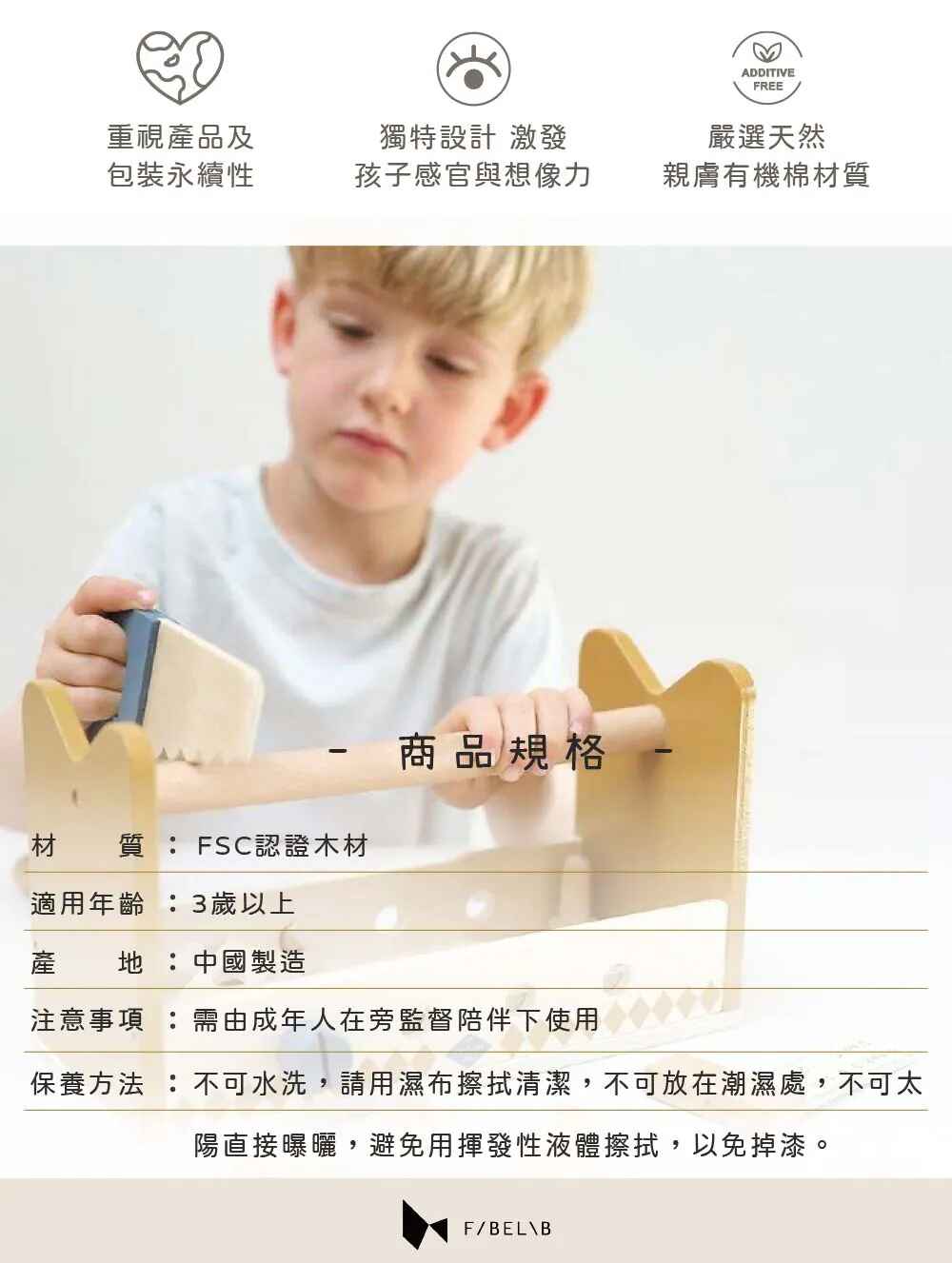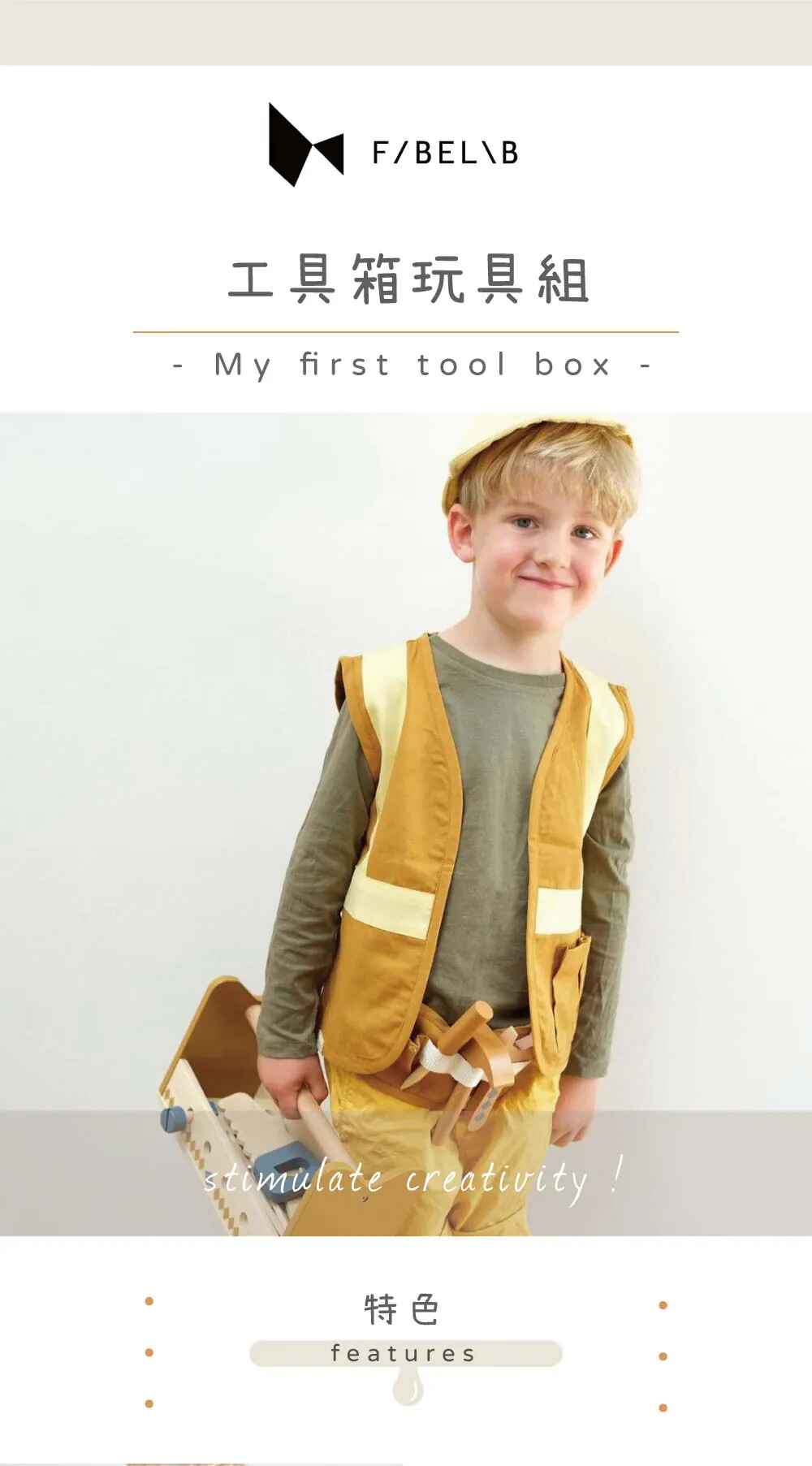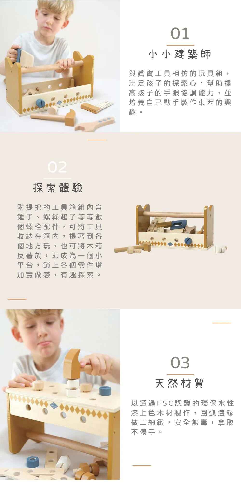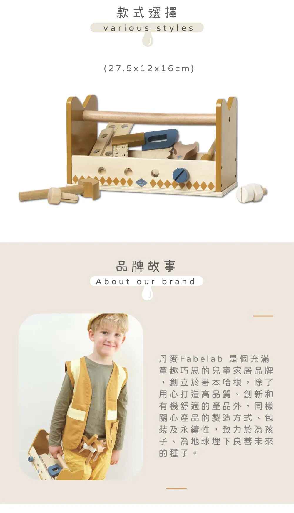 適用年齡:3歲以上材質:FSC認證木材尺寸:27.5x12x16cm內容物:工具箱玩具組x1產地:中國