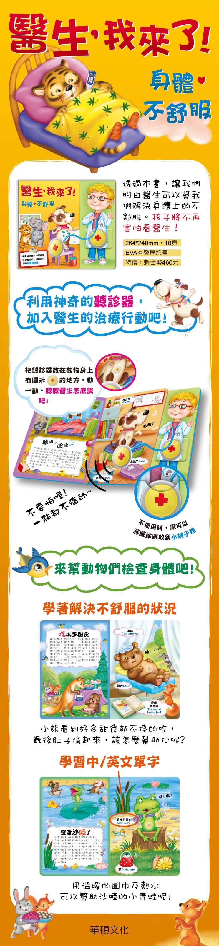 可以利用神奇聽診器,加入醫生的治療活動,引導孩子閱讀故事融入對話的情境。