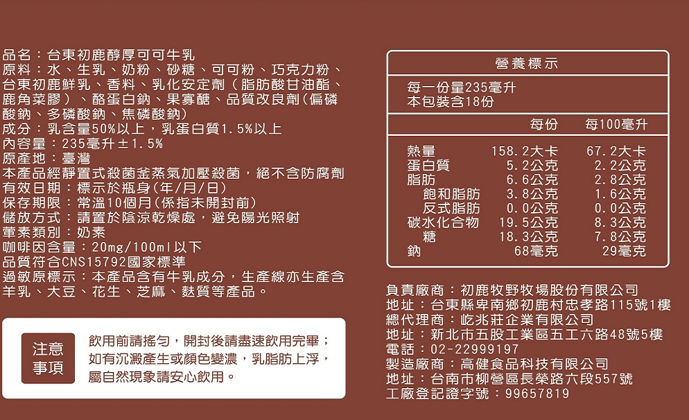 台東初鹿 醇厚可可牛乳235ml(8瓶/箱)