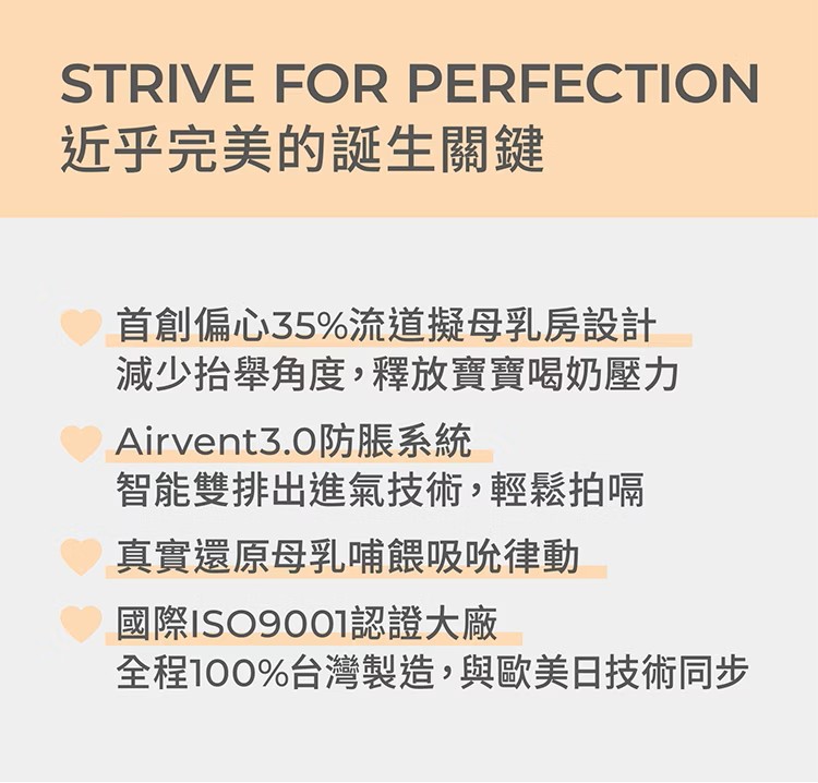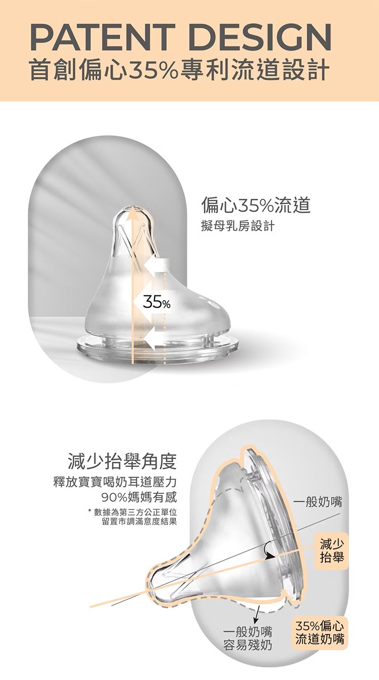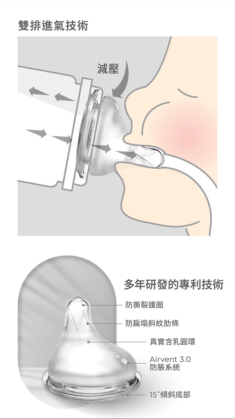 ●特色說明1.為新生兒打造白金級奶嘴,擬造媽媽乳房觸感。2.Aspir 5.0智能防脹氣減壓系統,防嗆奶、防溢奶、防脹氣。3.權威醫院唯一指定,新生兒哺餵成功率高。4.100%全程台灣製造,免去進口溯源的擔憂。5.獨家首創一瓶八用!分階段科學餵養:儲乳、餵乳、學飲。6.奶瓶容量、奶嘴尺寸、配件業界規..