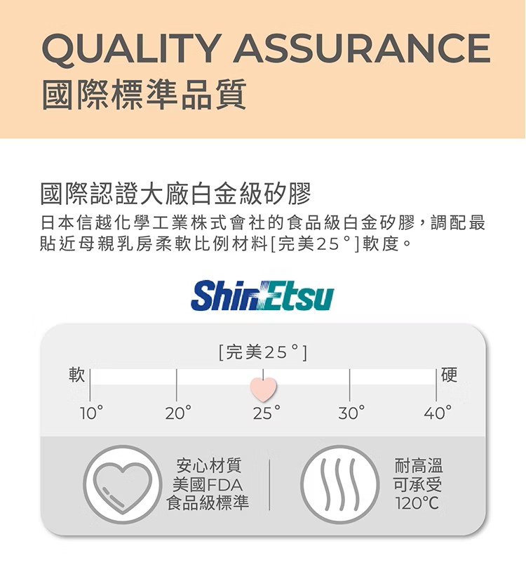 使用注意事項•每次使用前請清洗並消毒,以確保衛生•本產品不適用於長牙期嬰幼兒,長牙後應停止使用•為確保嬰幼兒安全與口腔衛生,建議每1-2個月更換新品•請依據嬰幼兒口腔尺寸與成長情況,適時更換適齡尺寸的安撫奶嘴•清洗後如奶嘴內部有積水,請輕壓奶嘴前端即可排出安全警告•本產品僅供安撫用途,請勿啃咬,不得..