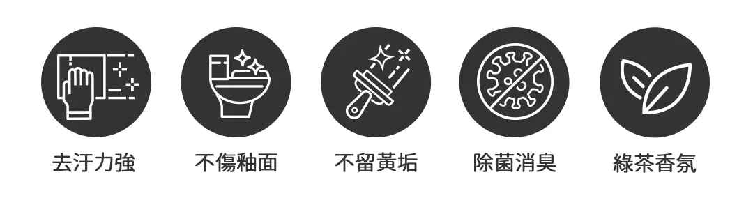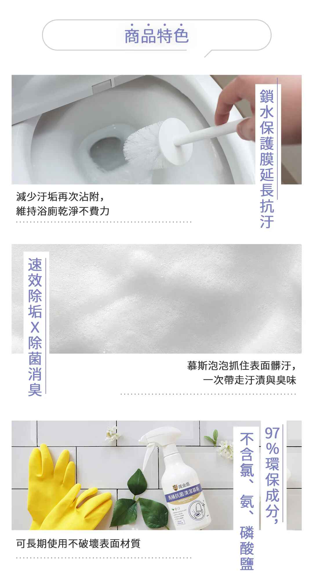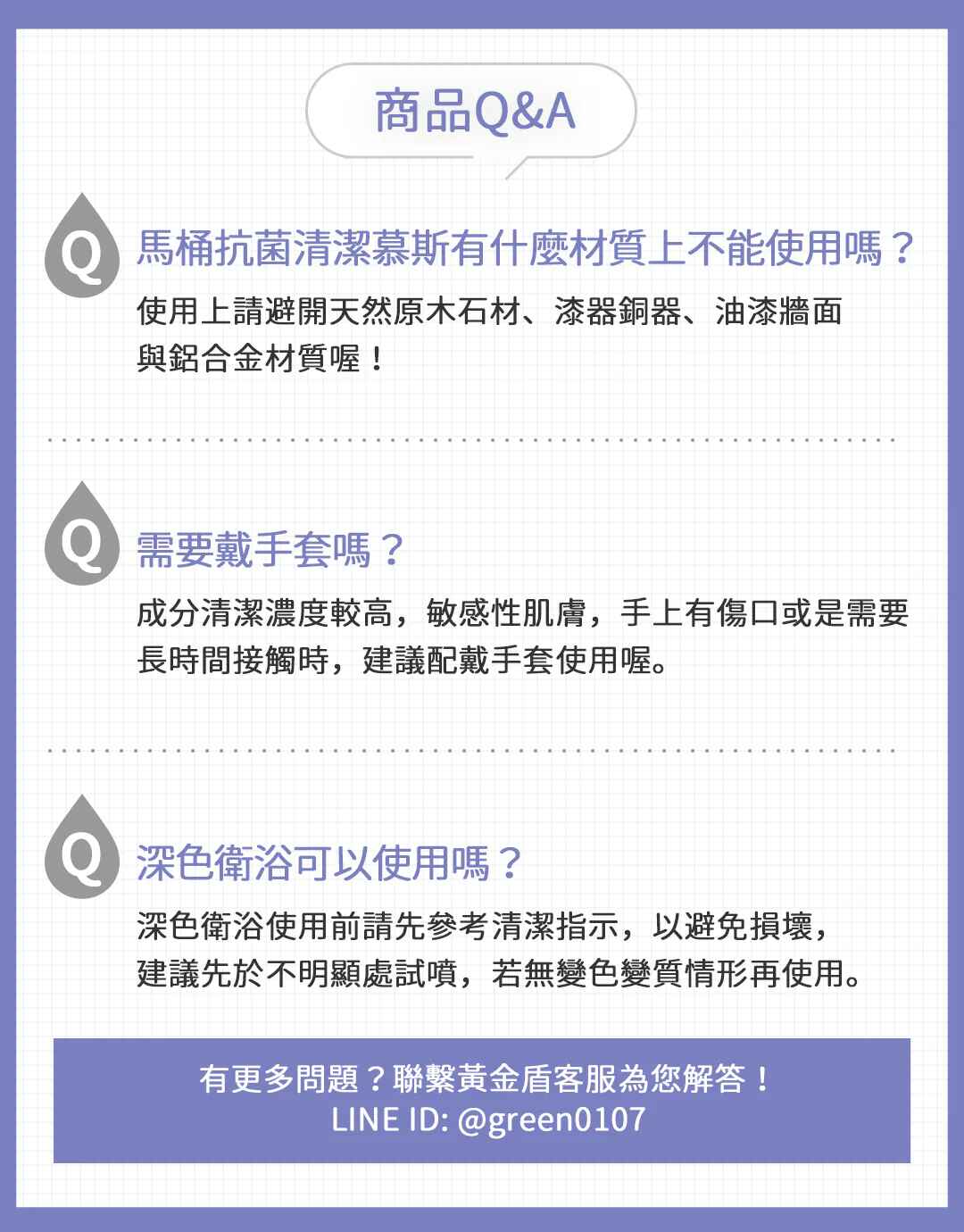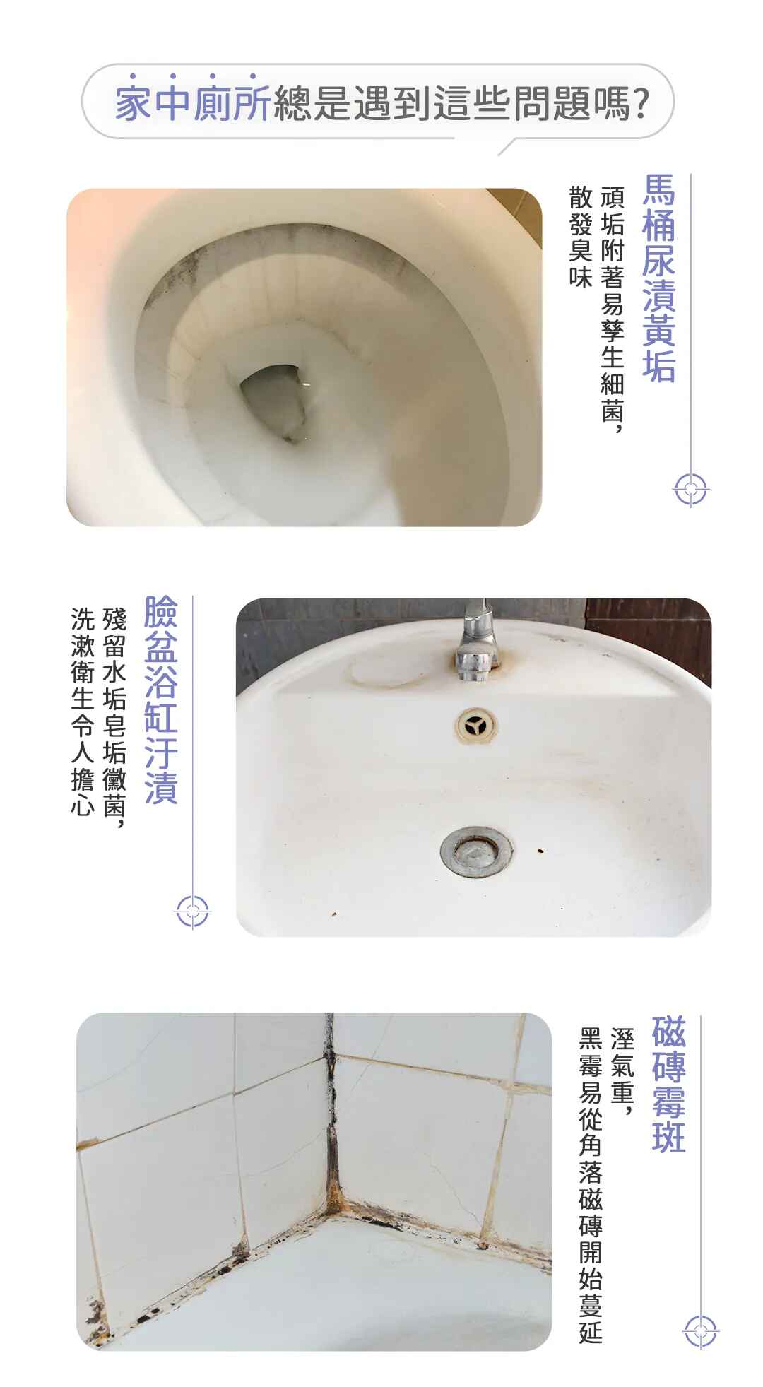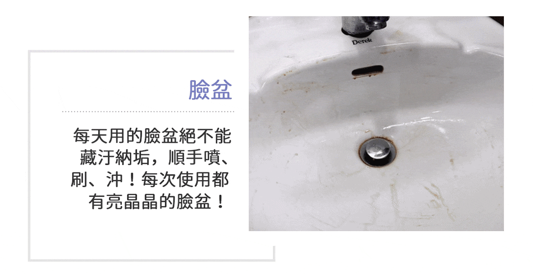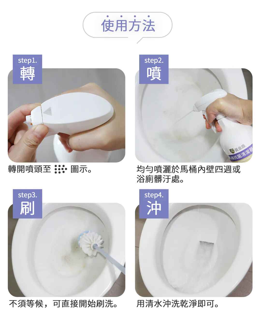 ►注意事項:1.深色衛浴使用前請先參考清潔指示,以避免損壞,建議先於不明顯處試噴,若無變色變質情形再使用。2.敏感膚質、有傷口或需長時間接觸,建議配戴手套使用。3.如不慎誤食或接觸眼睛,請立即以大量清水沖洗並盡速就醫。