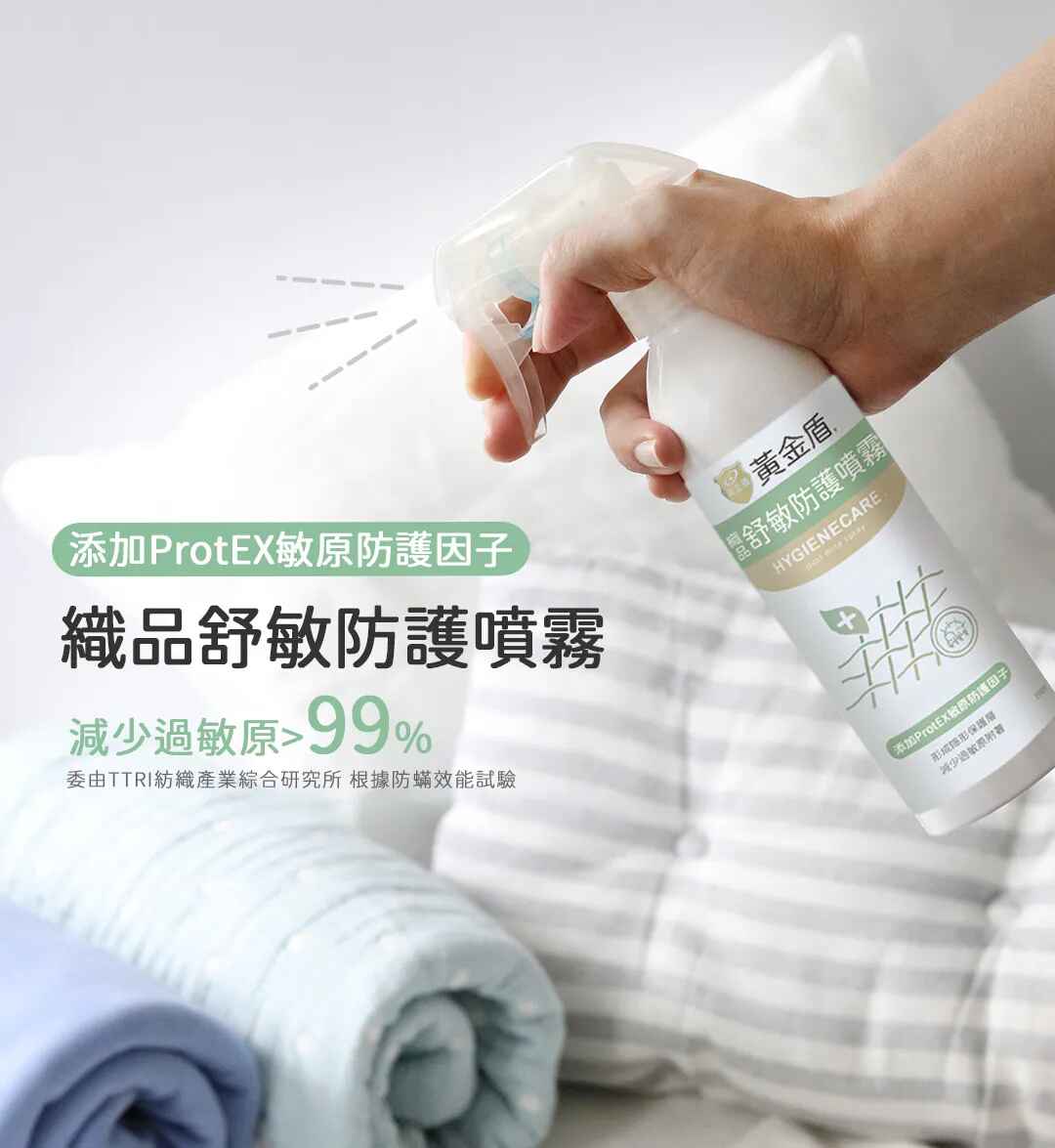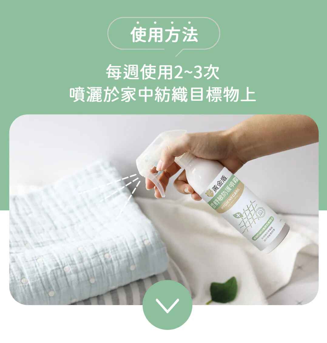 日常洗衣可搭配使用「黃金盾織品防蟎洗衣精」,效果更佳。