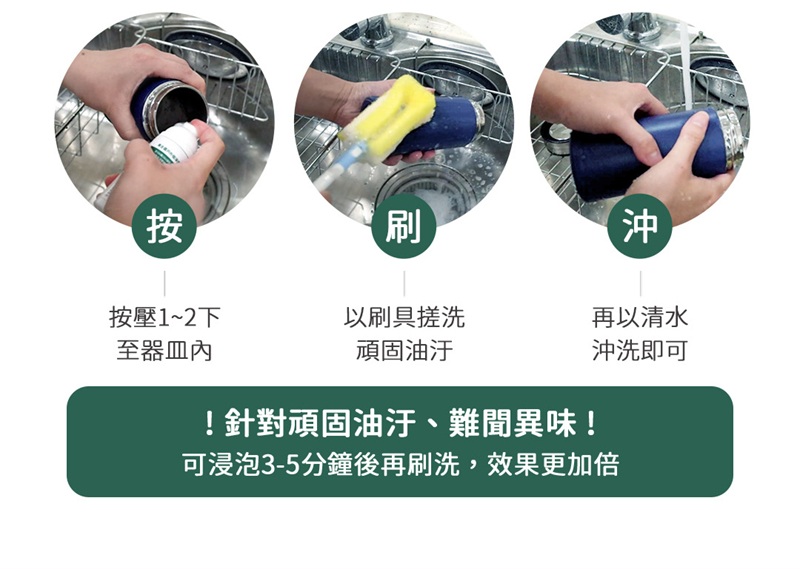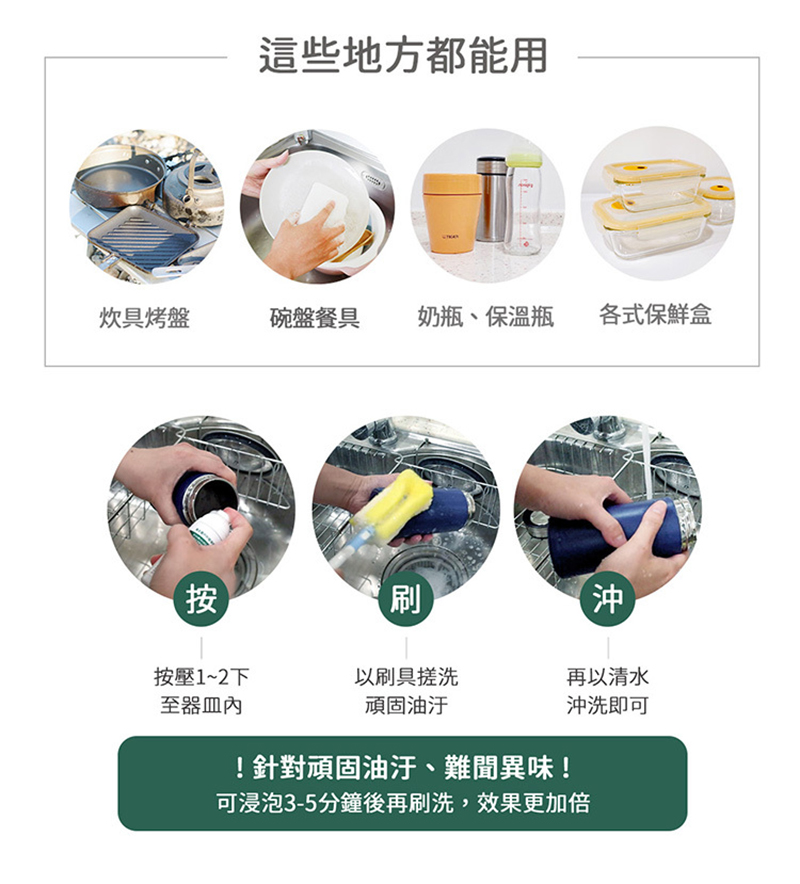 ►使用方法:直接按壓於器皿表面,用海綿或菜瓜布搓洗,再用清水洗淨即可。