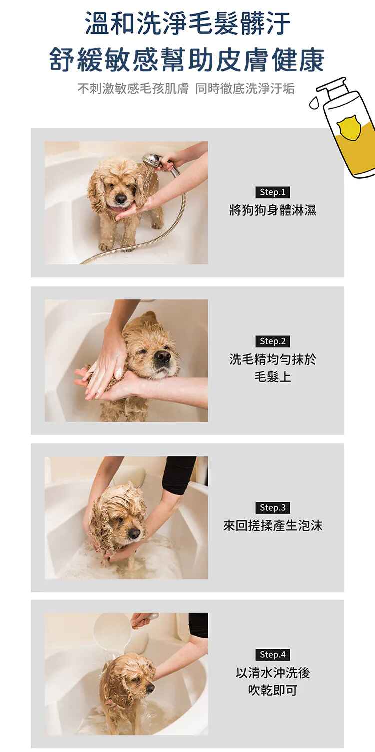 ►使用方法:將寵物身體淋濕,洗毛精均勻抺於毛髮上,搓揉產生泡沬後,再徹底沖洗。第一次洗淨狗狗皮毛上堆積油垢,第二次徹底潔淨每根毛髮。