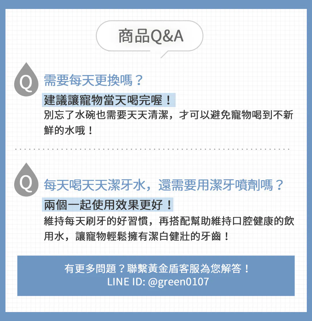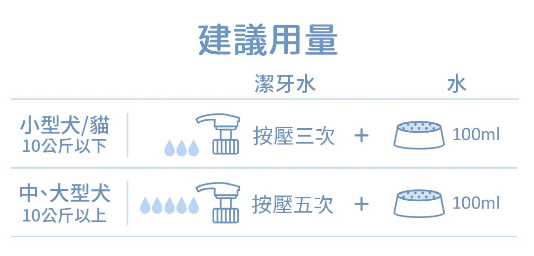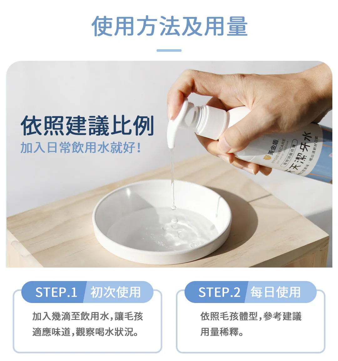 ►使用方法:視寵物體型以1:10~20的比例稀釋,加入日常飲用水飲用即可,不建議添加在有濾芯的飲水機中使用。