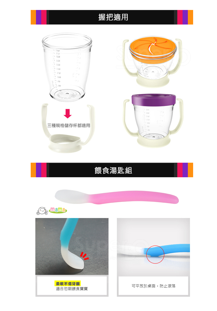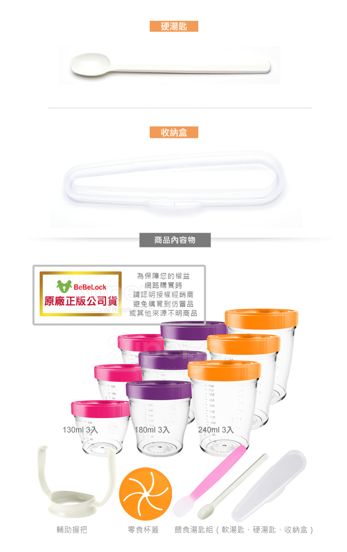 內容物:130ml/3入、180ml/3入、240ml/3入、輔助握把*1、兩階段湯匙組*1