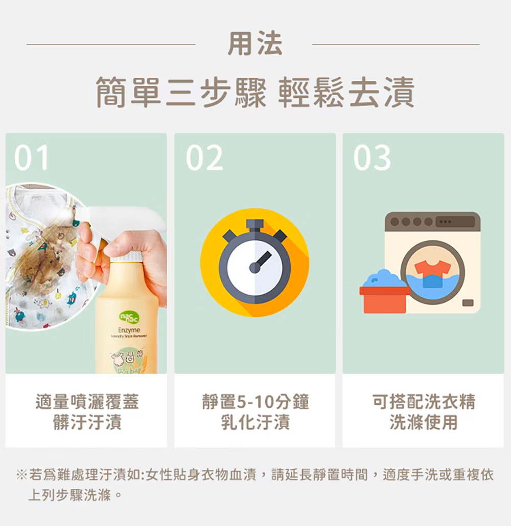 ◎七重酵素配方:結合專利去漬因子,有效去除奶垢、果汁、食物殘漬及尿便漬等多種汙漬。