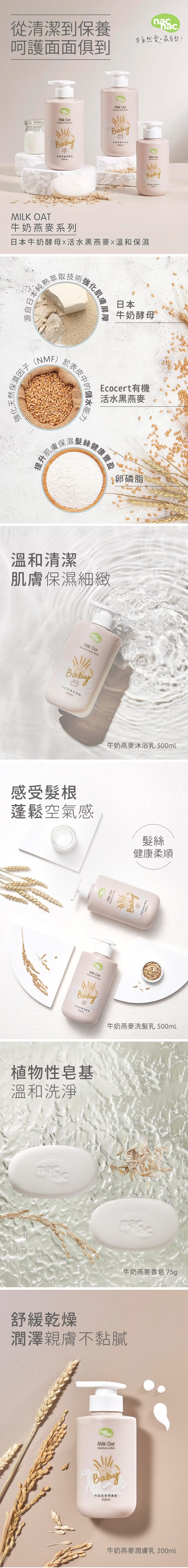 ◎日本牛奶酵母萃取精華富含多種氨基酸、乳酸、醣類,保護肌膚健康◎Ecocert認證瑞士活水黑燕麥萃取搭配黃金荷荷芭油,多重保濕因子,滋潤肌膚◎輕甜寶寶奶香為您的寶貝帶來潔淨、舒適的沐浴體驗