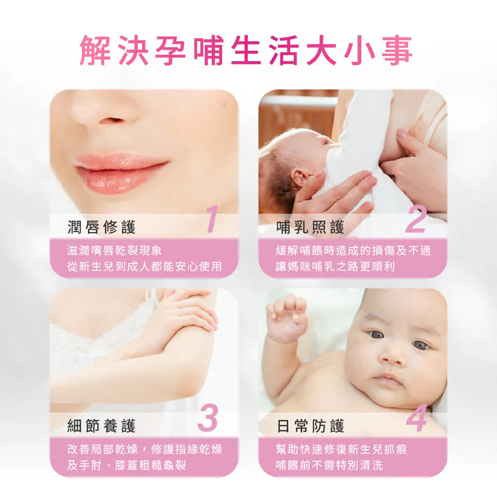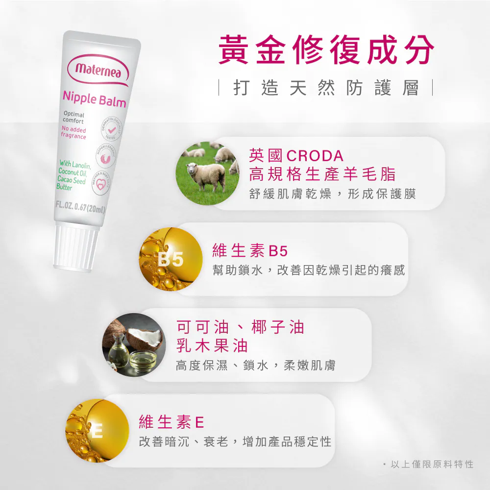 提供孕媽媽最高等級的呵護,乳尖修護膏含可可油、椰子油、乳木果油,