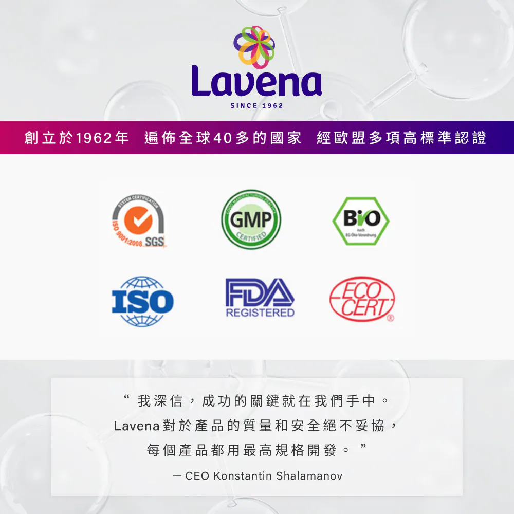 純淨安定、無色素、無香配方,全系列產品均有歐洲使用檢測報告。