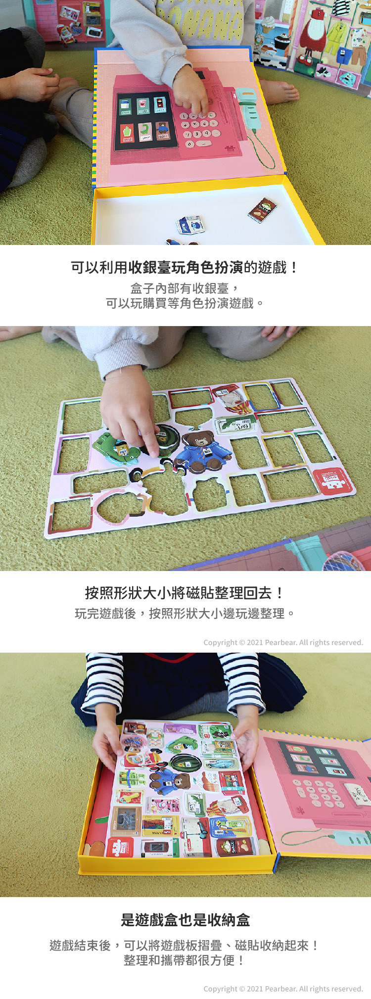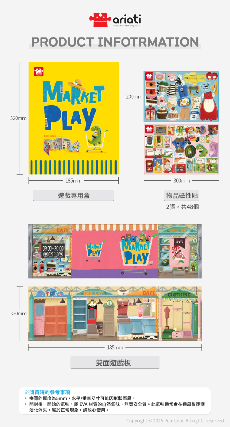 ‧遊戲盒x1、雙面遊戲板x1、物品磁性貼共48個‧磁性貼的厚度為5mm,水平/垂直尺寸可能因形狀不同而有異。‧開封後一開始的氣味,屬 EVA 材質的自然氣味,無毒安全質。此氣味通常會在通風後逐漸淡化消失,屬於正常現象,請放心使用。