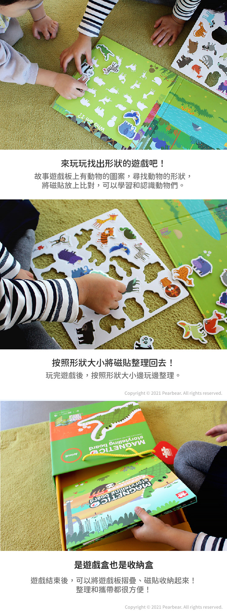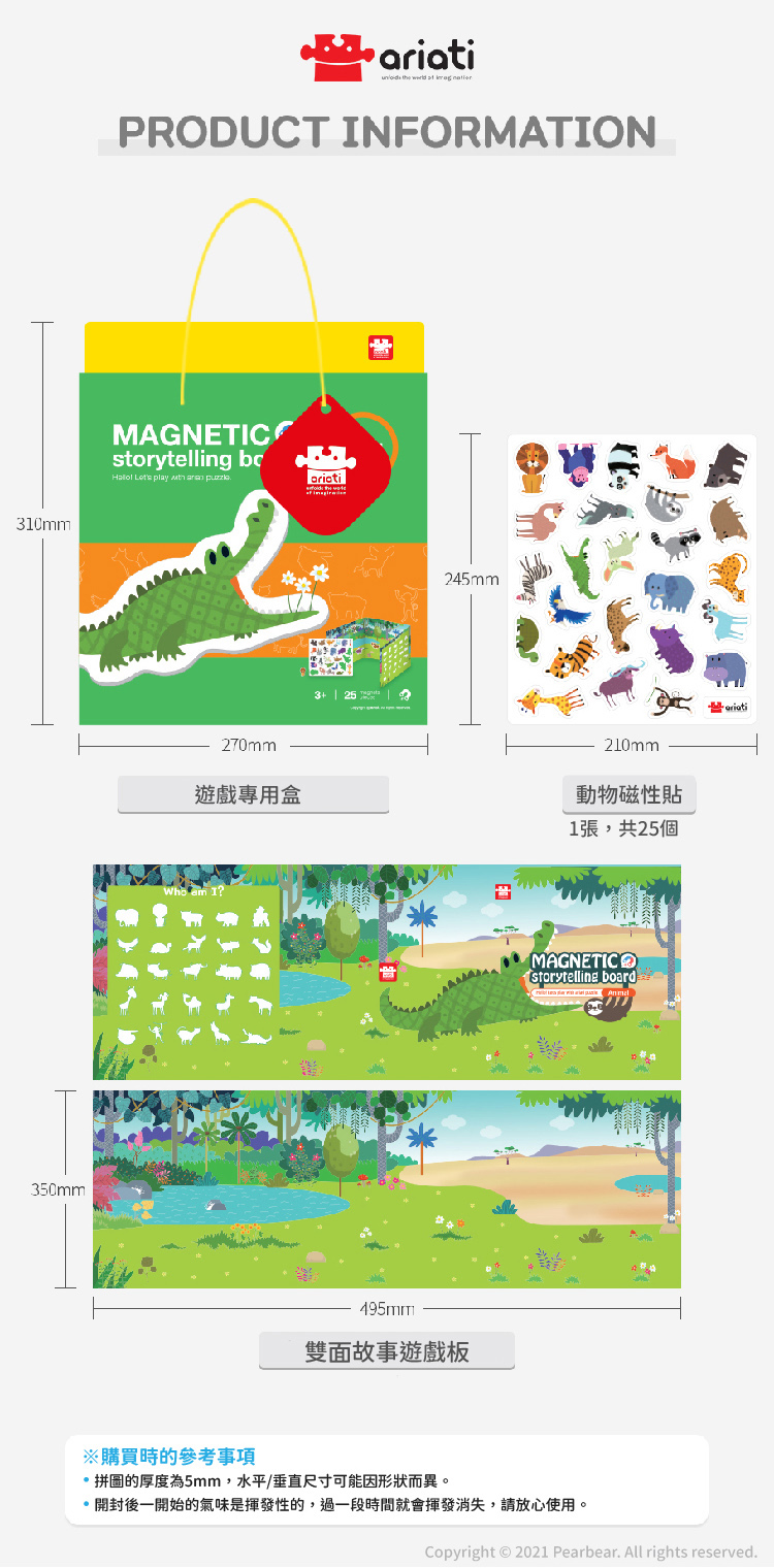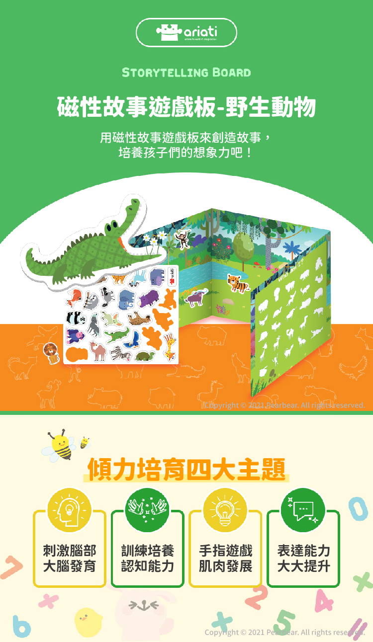 ‧雙面故事遊戲板x1、野生動物磁性貼x25。
