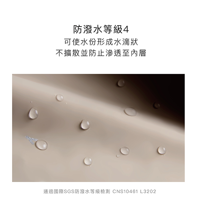 2.通過國際SGS防潑水等級檢測,防潑水等級4,可使水份形成水滴狀,防止滲透至內層。