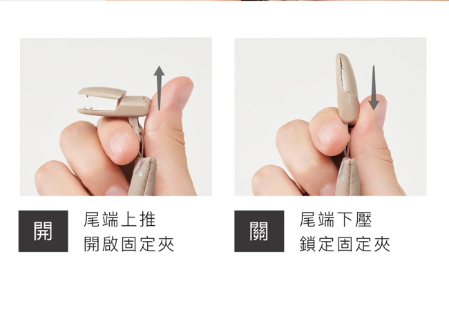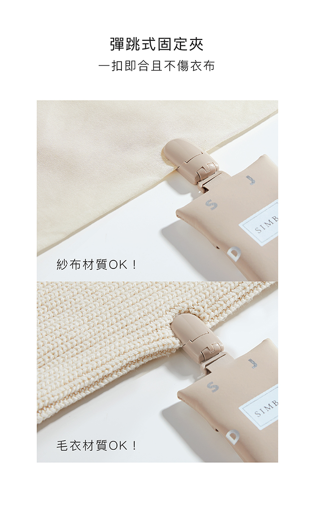 7.彈跳式固定夾,一扣即合且不傷衣布,厚薄衣物都能穩穩夾住。