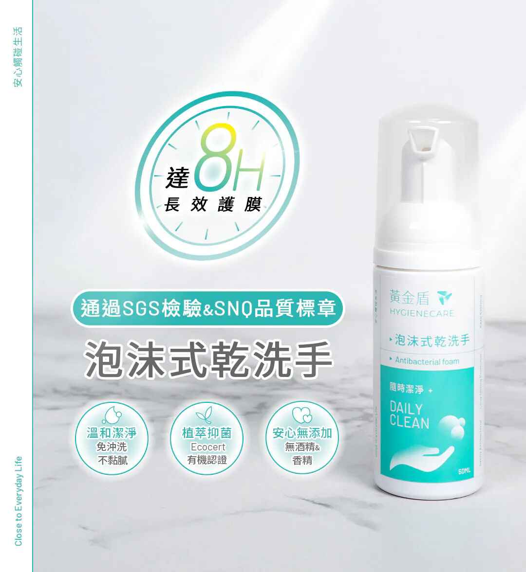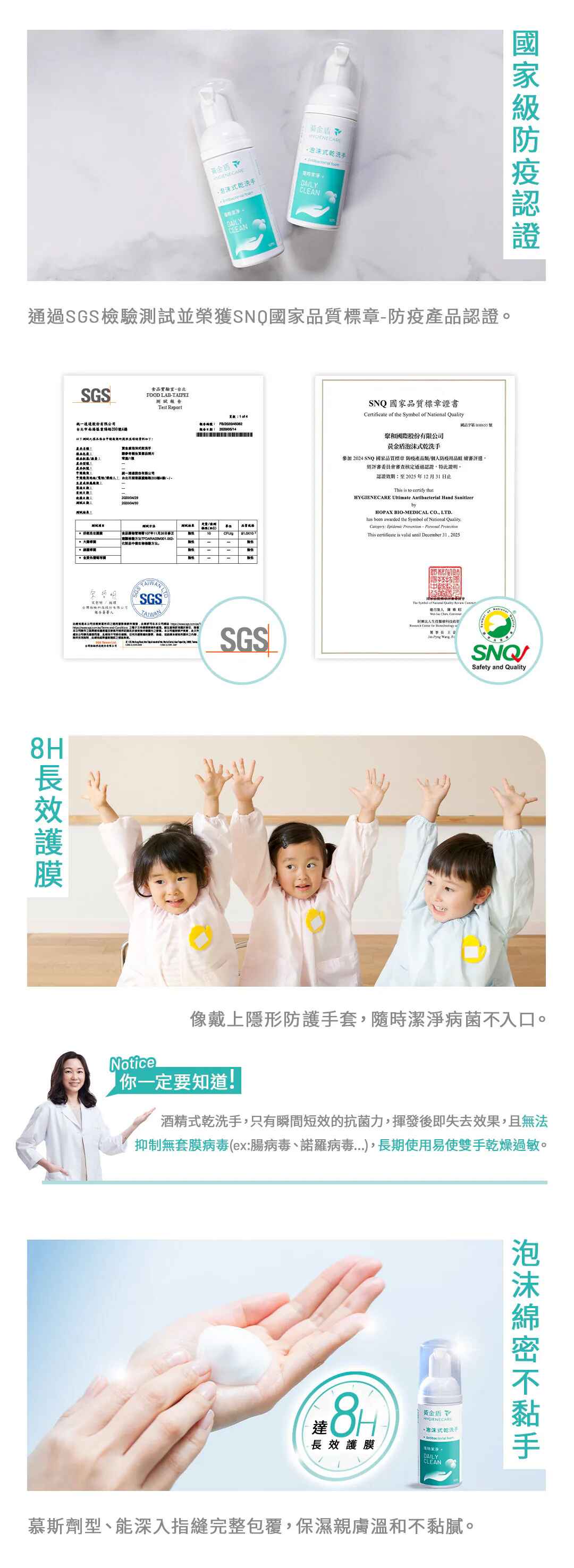 雙手是病菌傳播的主要途徑!嬰幼兒免疫力低尤為重要!外出用餐、遊戲、搭乘大眾運輸時,手部接觸過的地方,皆可能潛藏危機。黃金盾泡沫式乾洗手,獨家抗菌配方不含酒精與香精,隨身瓶設計方便攜帶,8H隱形護膜,是日常與外出的最佳手部清潔選擇!