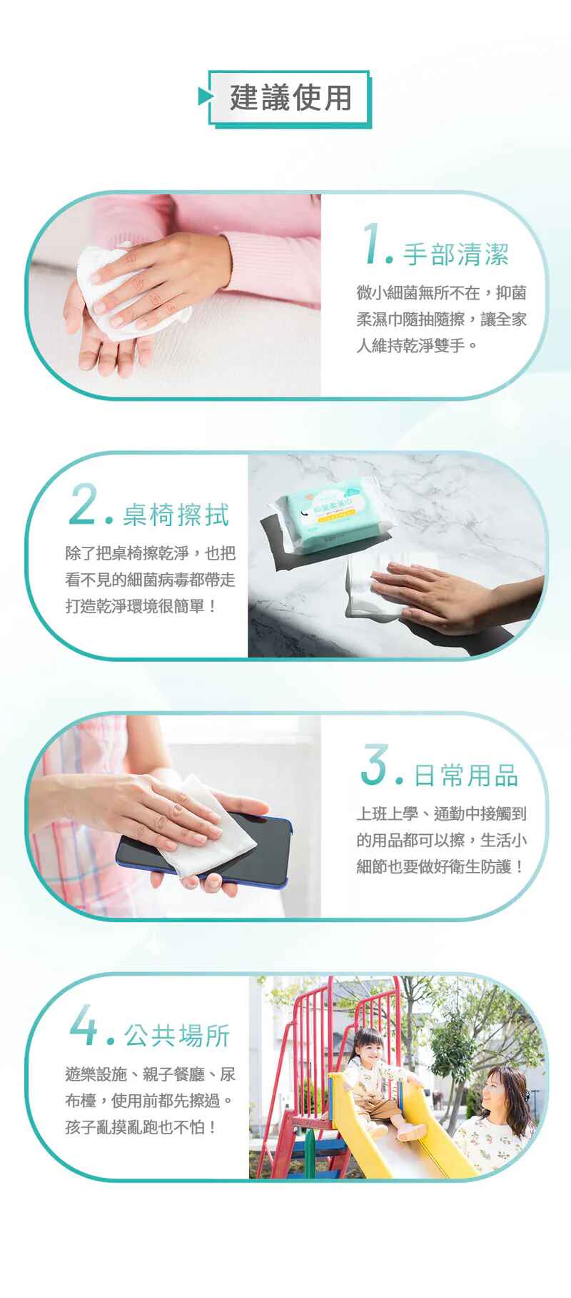 👶學齡前幼童:幼兒園、托嬰中心擦拭雙手與玩具 🎠公共設備:遊樂設施、尿布檯、餐廳座椅...清潔🍔外出用餐:擦拭餐具與桌面,減少細菌病原殘留🚈通勤出遊:捷運、公車、火車等扶桿與座位清潔 .jpg)