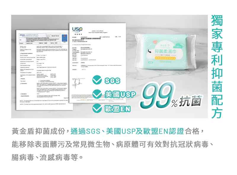 一般純水濕紙巾僅能去除表面污垢,對細菌與病毒防護有限。黃金盾配方結合嬰兒濕紙巾的溫和特性與專利抑菌成分,可有效對抗冠狀病毒、腸病毒等常見病原,為寶寶與全家提供更完整的衛生保護。.jpg)