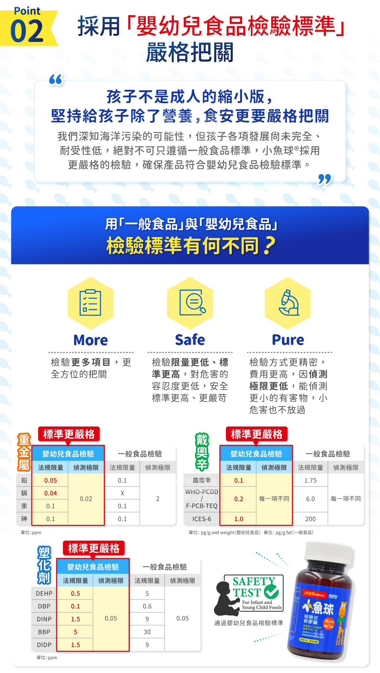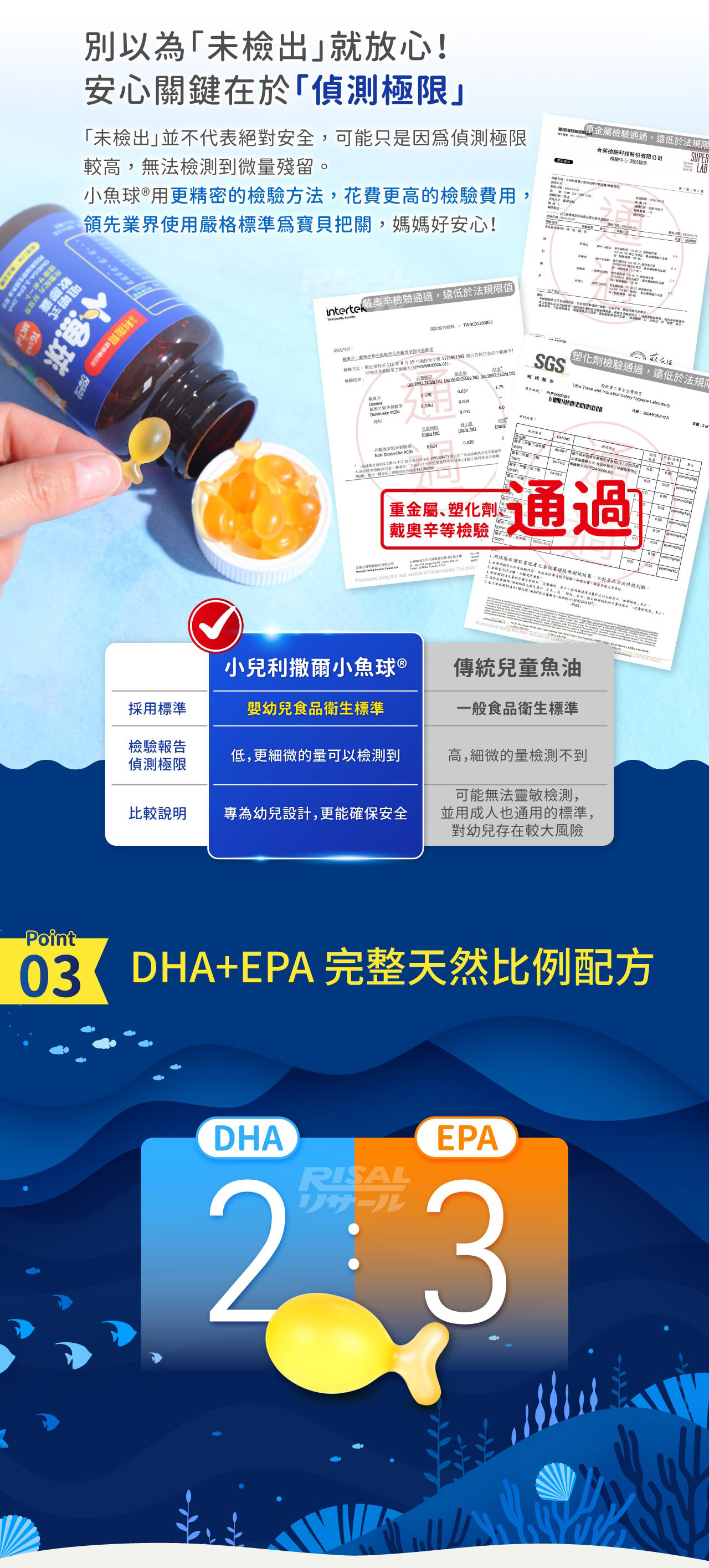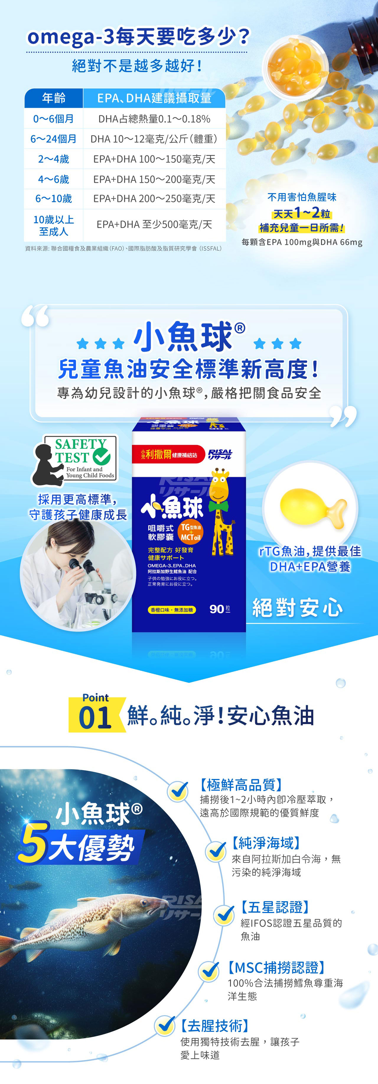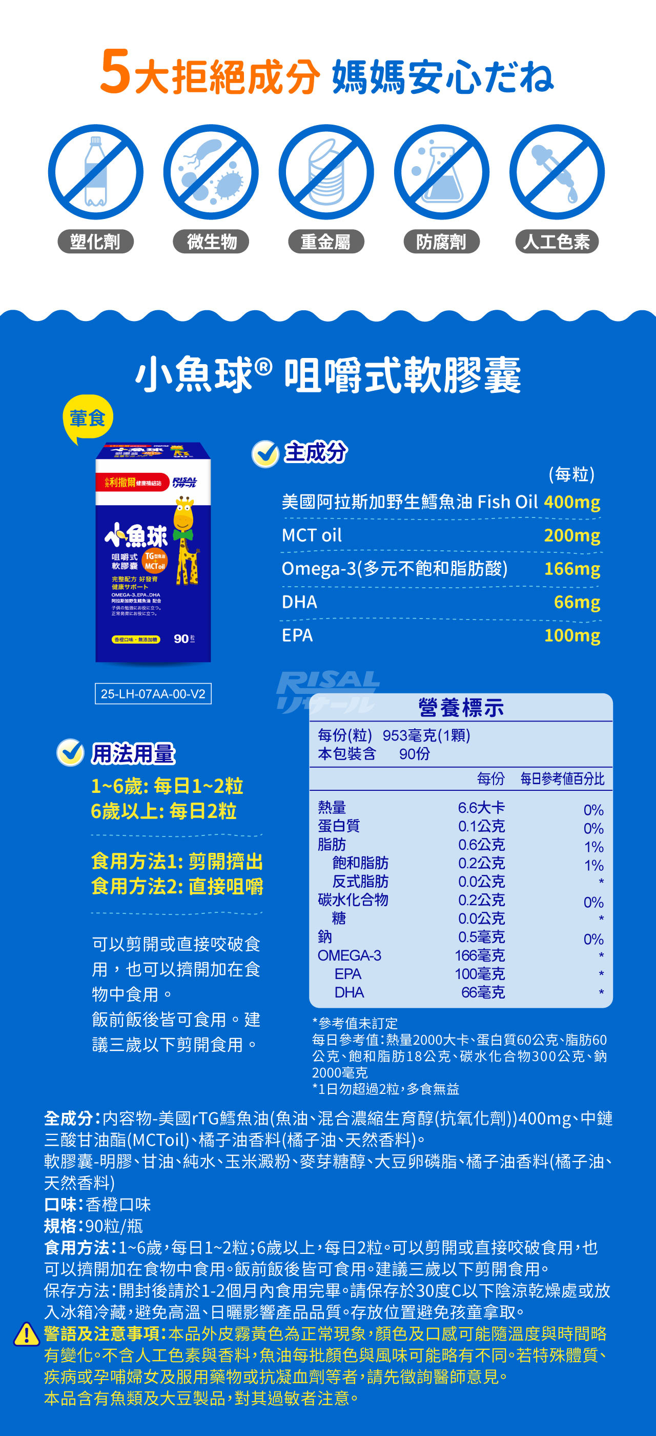 - 小兒利撒爾小魚球嚴選美國阿拉斯加野生鱈魚油精鍊而成,7道純化技術處理,無魚腥味、不含糖份、無防腐劑、無重金屬汙染。每顆含400mg濃縮鱈魚油,EPA 100mg與DHA 66 mg,幫助健康成長,輕鬆學習。