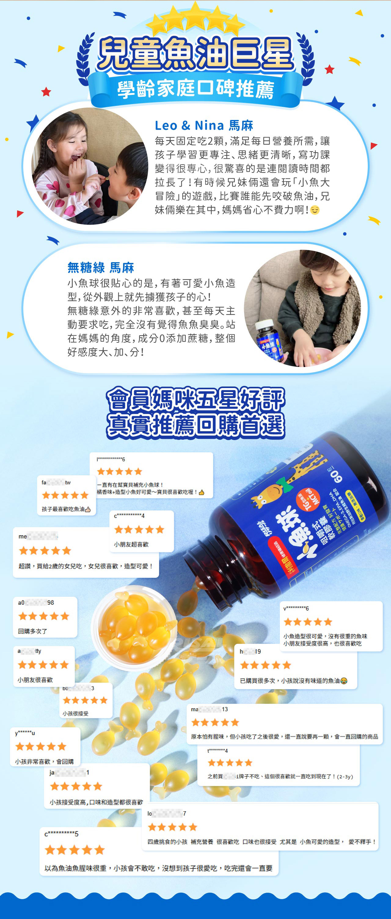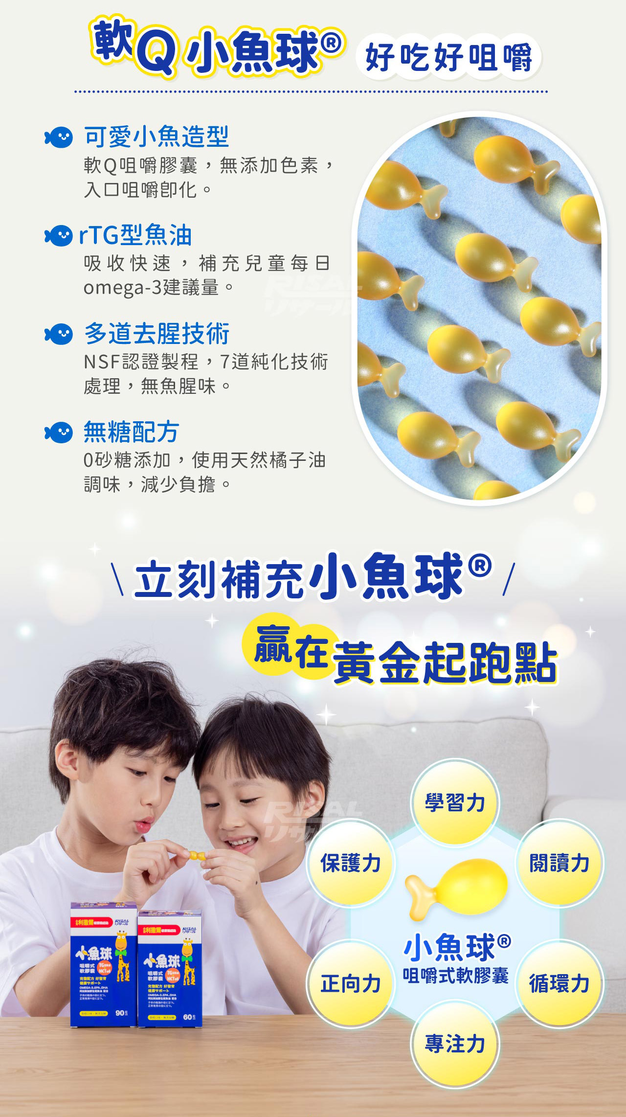 - 專為兒童設計-軟Q可咀嚼的小魚形外皮,無人工色素。
