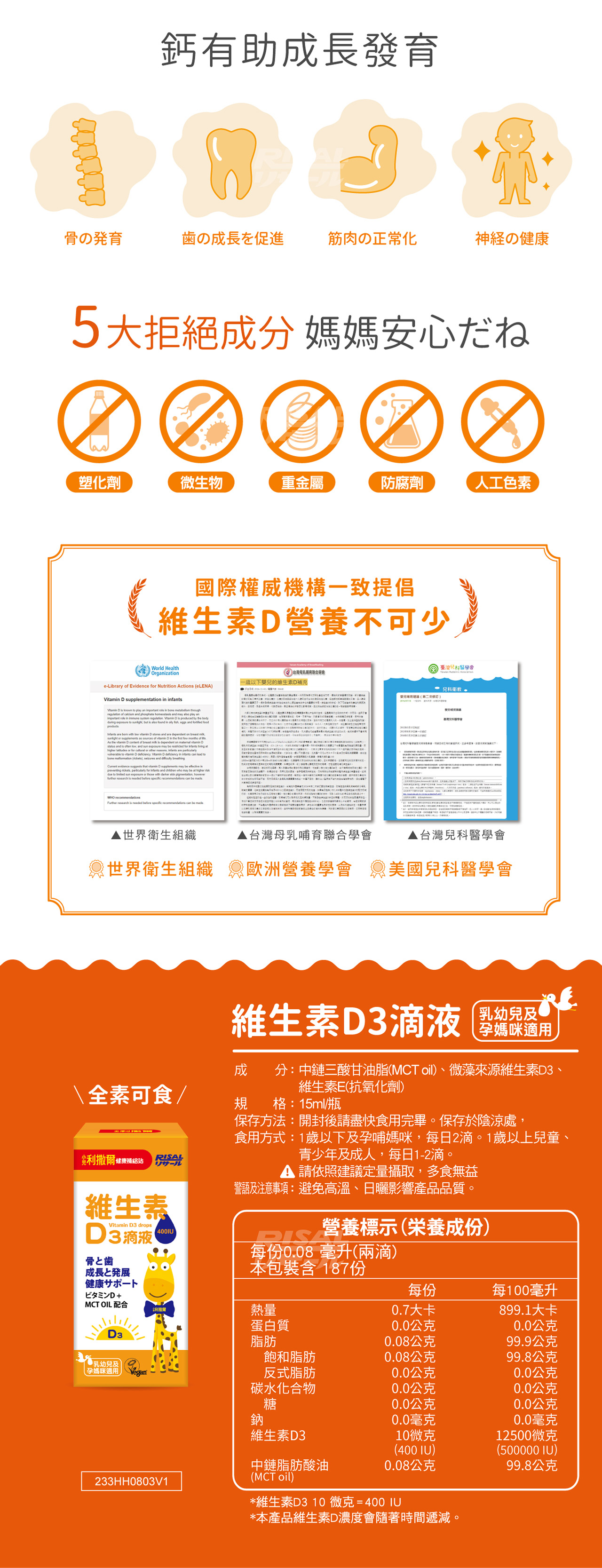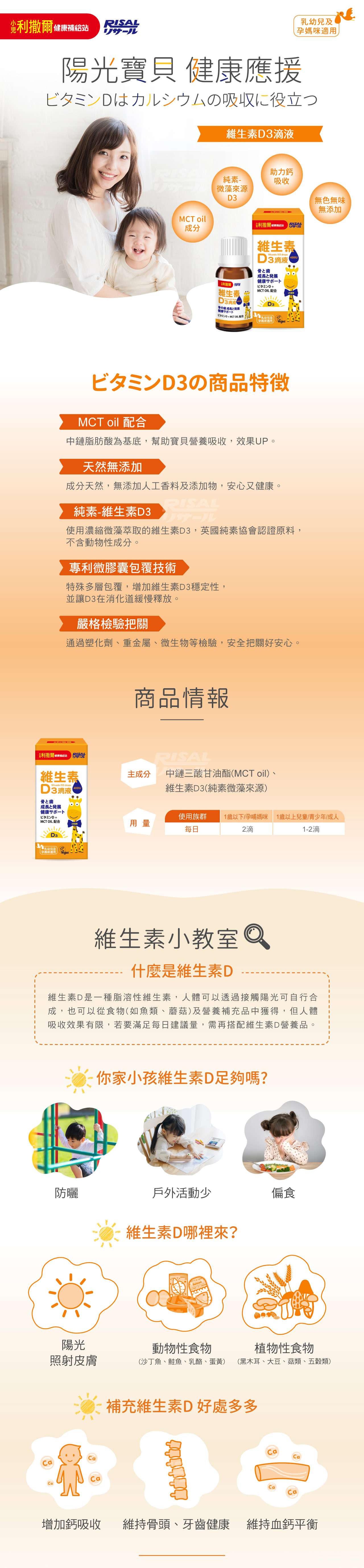 - 專為成長階段兒童設計的好吸收配方,使用中鏈脂肪酸(MCT oil)為基底,天然無添加,每日兩滴=400IU非活性D3補充,幫助維持生理機能,增進鈣質吸收,幫助牙齒及骨骼正常發育,維持血鈣平衡,維持神經、肌肉的正常生理功能。