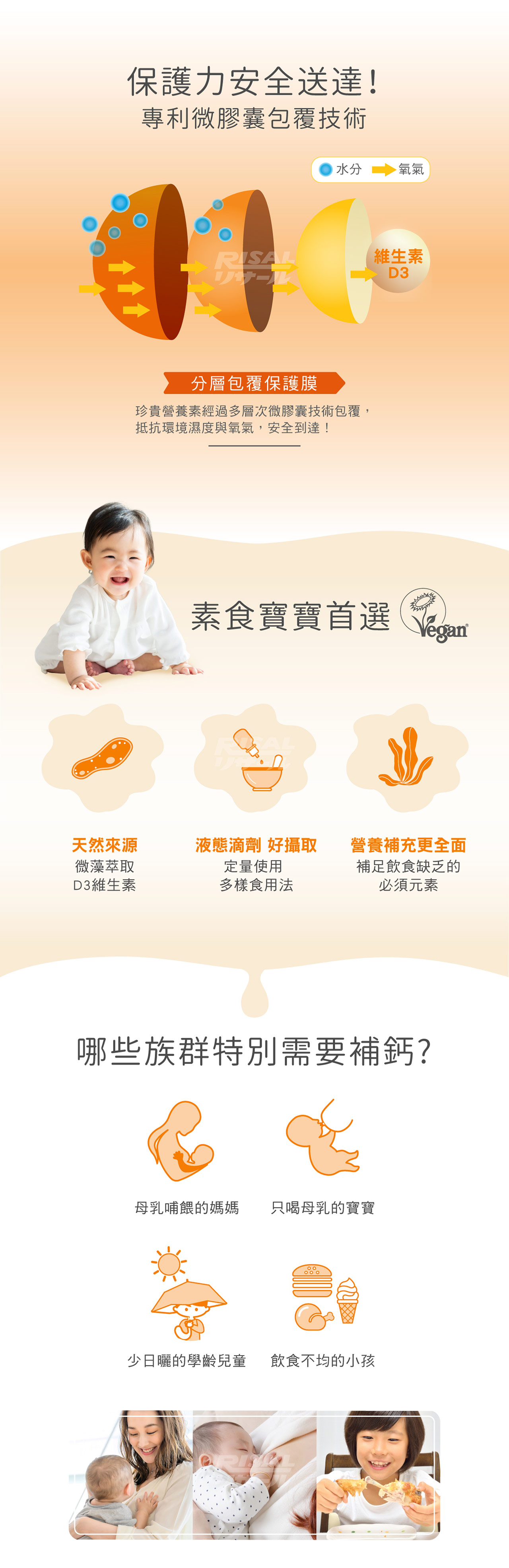 - 主成分中鏈三酸甘油酯油(MCT oil)、微藻來源維生素D3、維生素E(抗氧化劑)