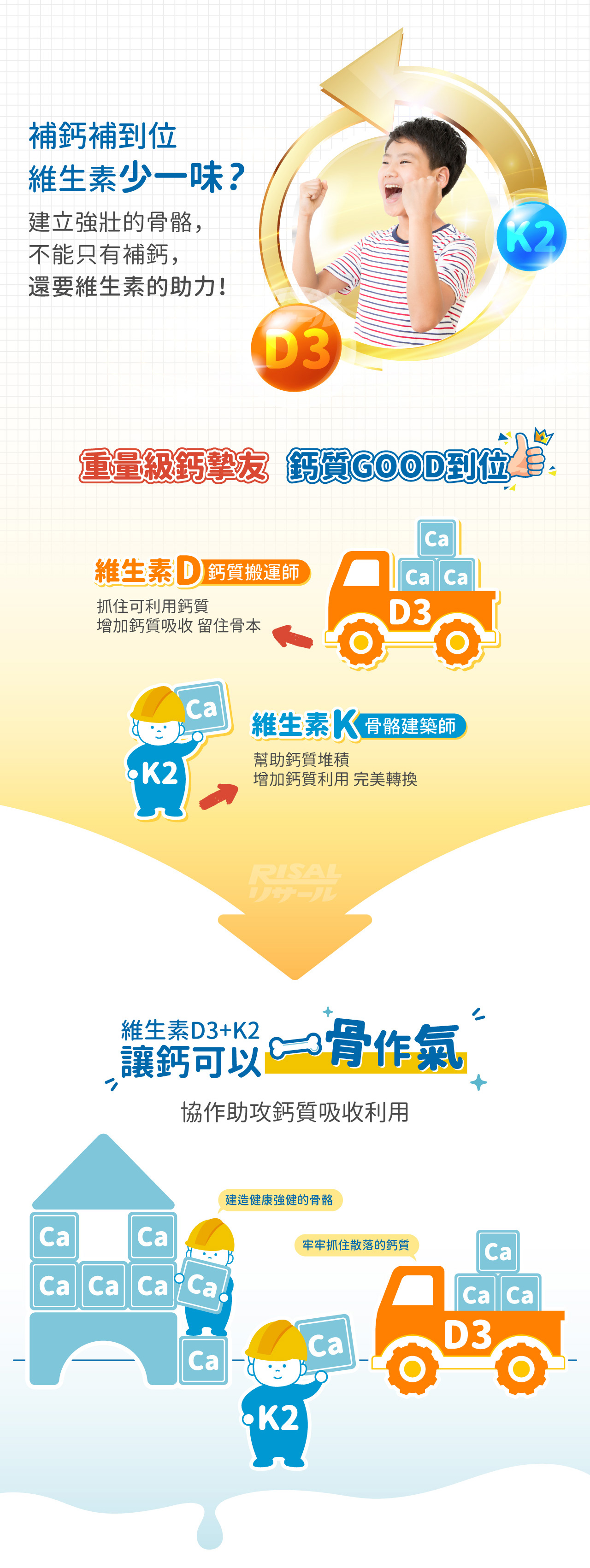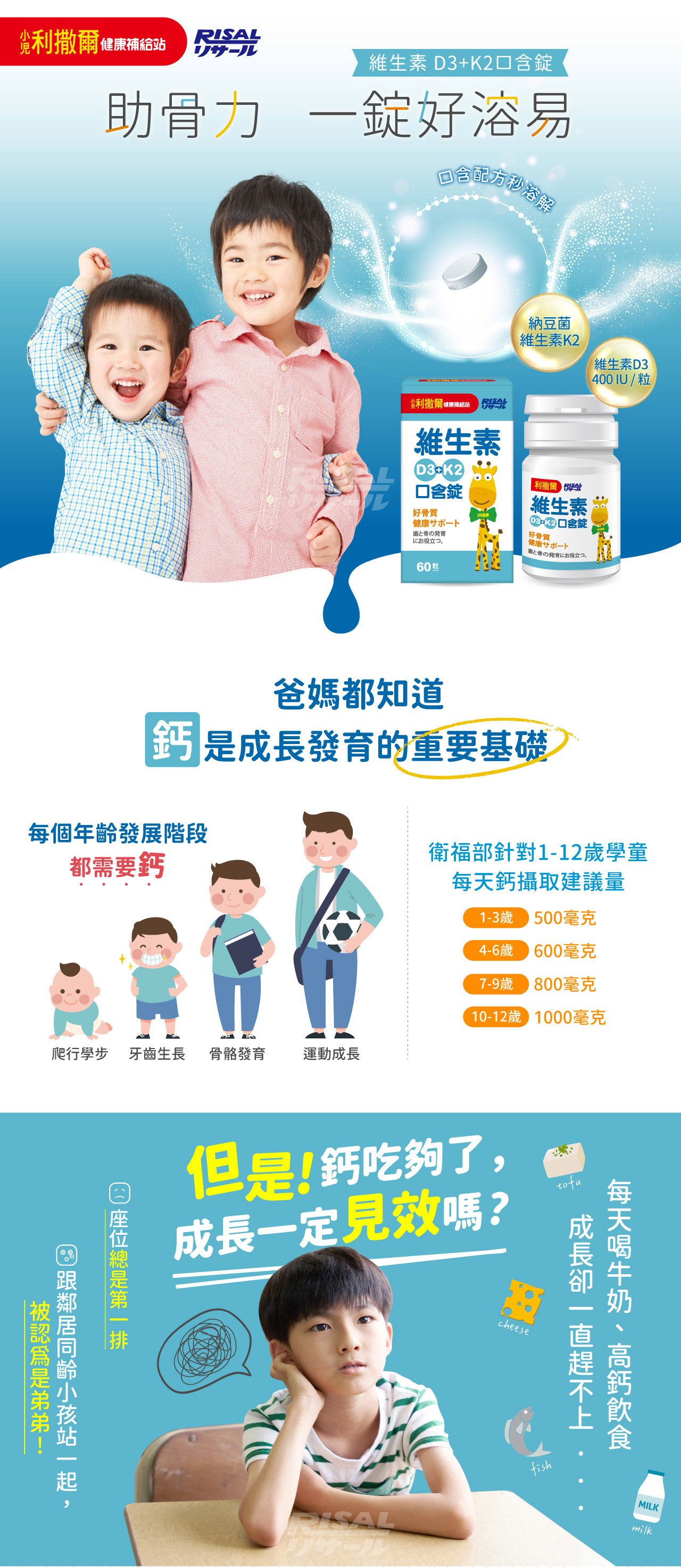 - 小兒利撒爾維生素D3+K2口含錠,專為孩子的骨骼發育而設計。我們知道作為媽媽,你最關心的是孩子的健康和成長。小兒利撒爾RISAL是日本品牌,擁有60年的專業經驗,絕對是你最放心的選擇。