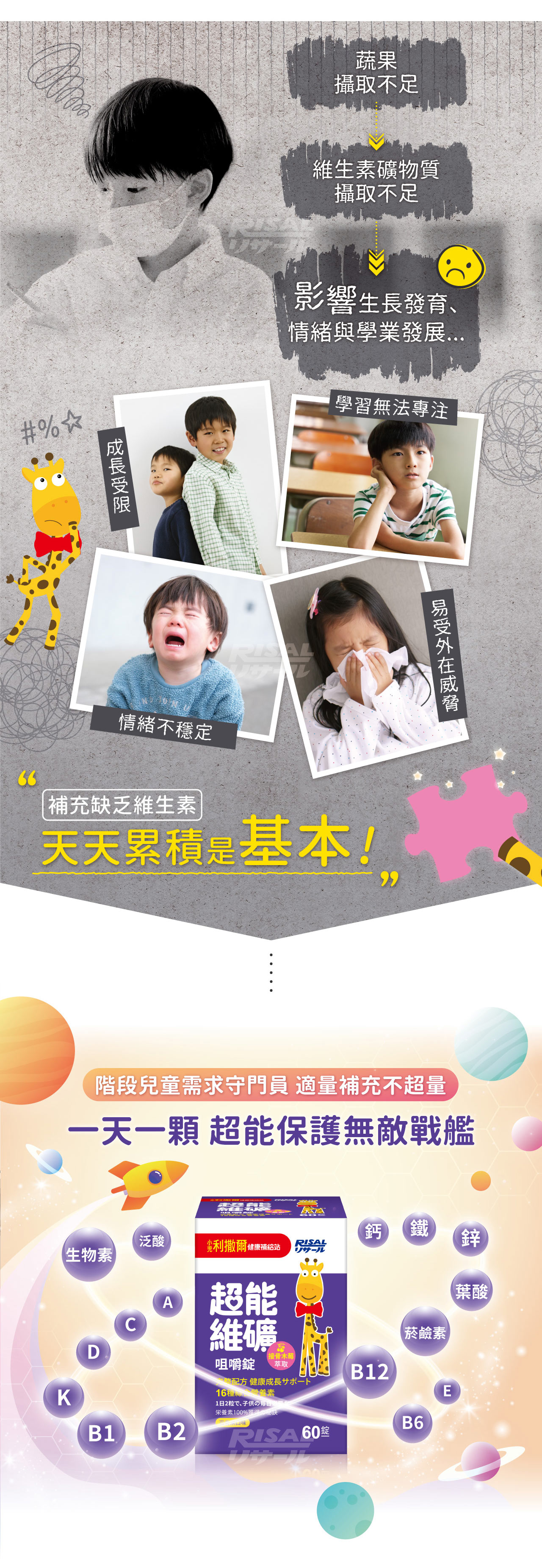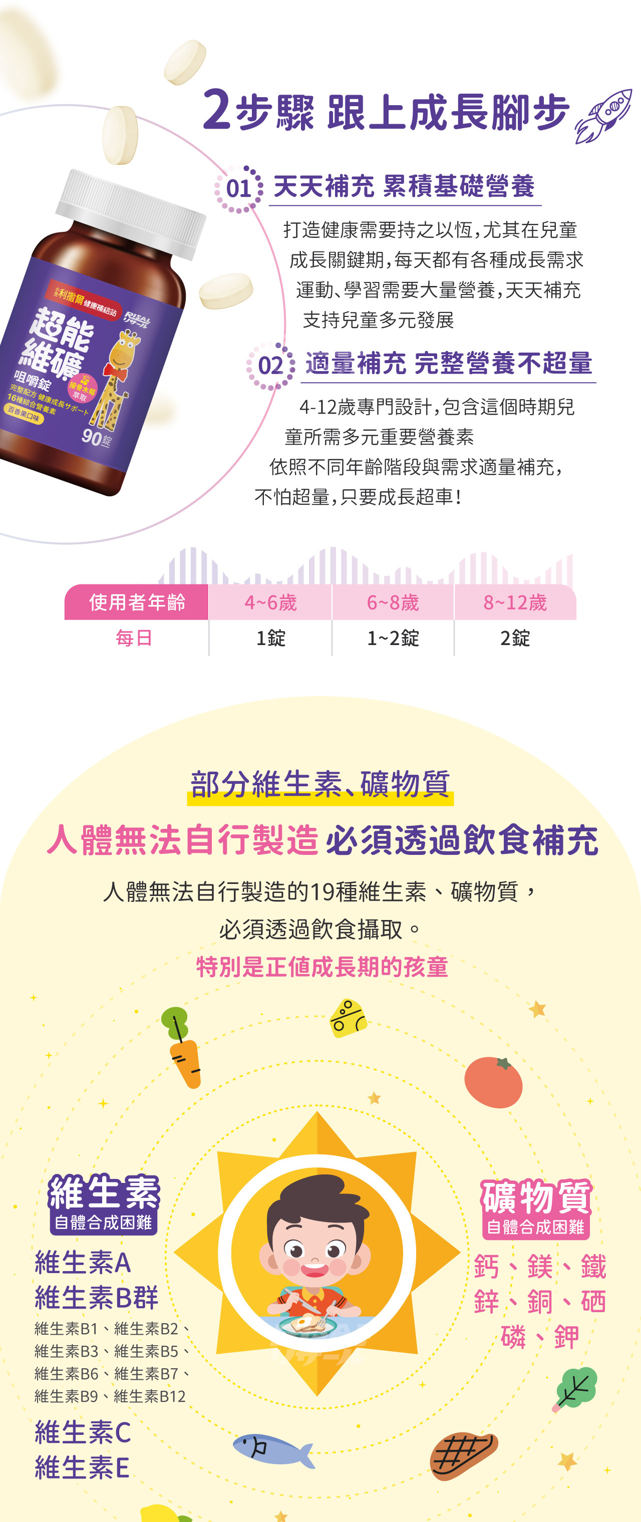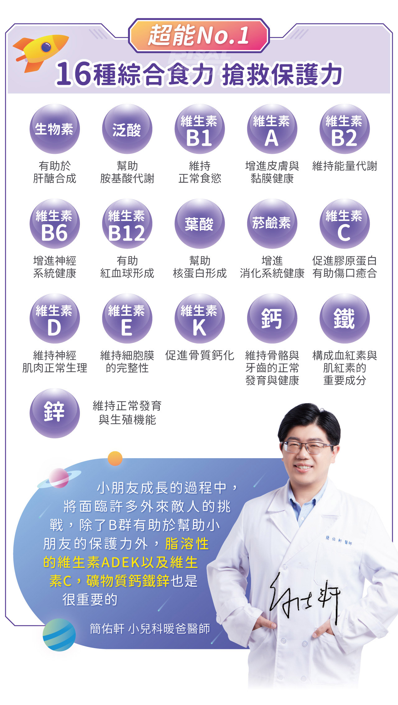 - ˙完整16種營養力-補充兒童易忽略的綜合維生素礦物質攝取,滿足成長需求。