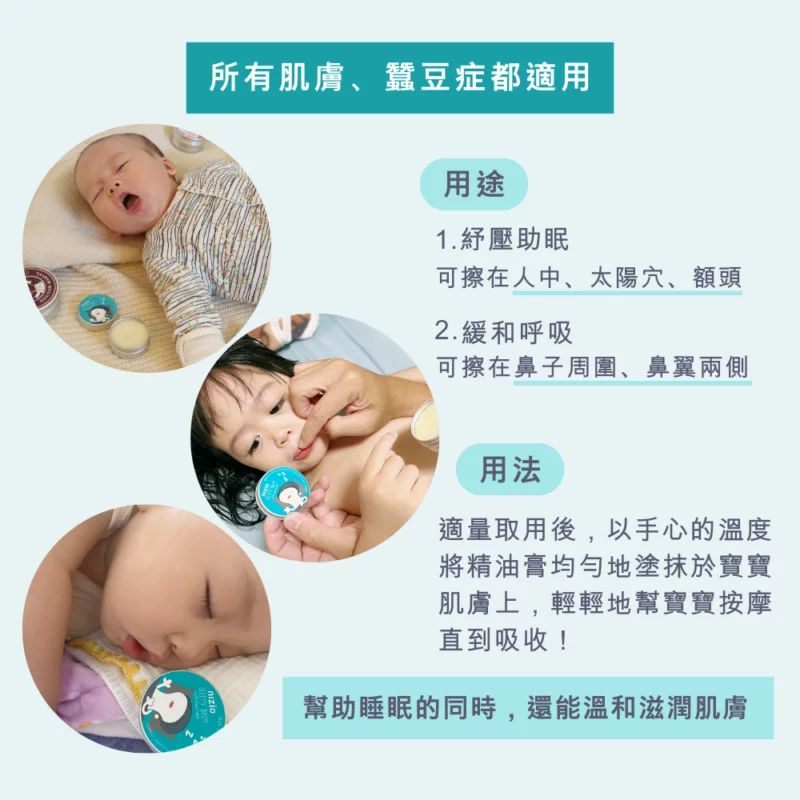 使用方式:可取適量塗抹於臉部、鼻中隔兩翼、人中、太陽穴,輕輕按摩。新生兒、大人、蠶豆症體質適用。